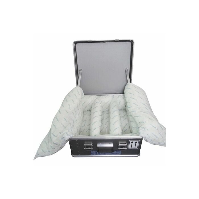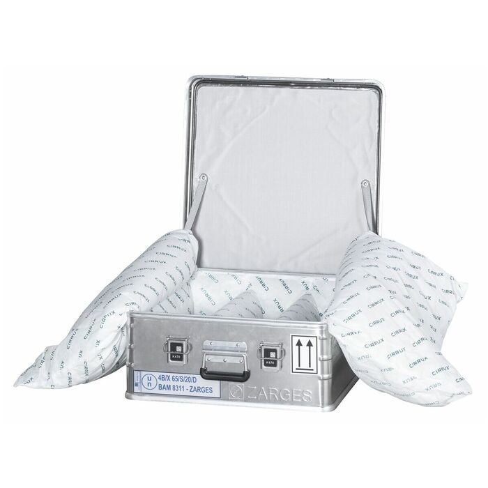 Stoppnings- och uppsugningsmaterial ska vara obrännbart, inte elektriskt ledande och dammfritt. Locktätning av skumplast. Staplingsbar, med Comfort-lås. Största bruttomassa enligt tillståndet för farligt gods: 65 kg.