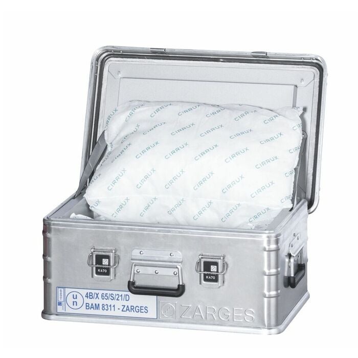 Stoppnings- och uppsugningsmaterial ska vara obrännbart, inte elektriskt ledande och dammfritt. Locktätning av skumplast. Staplingsbar, med Comfort-lås. Största bruttomassa enligt tillståndet för farligt gods: 65 kg.