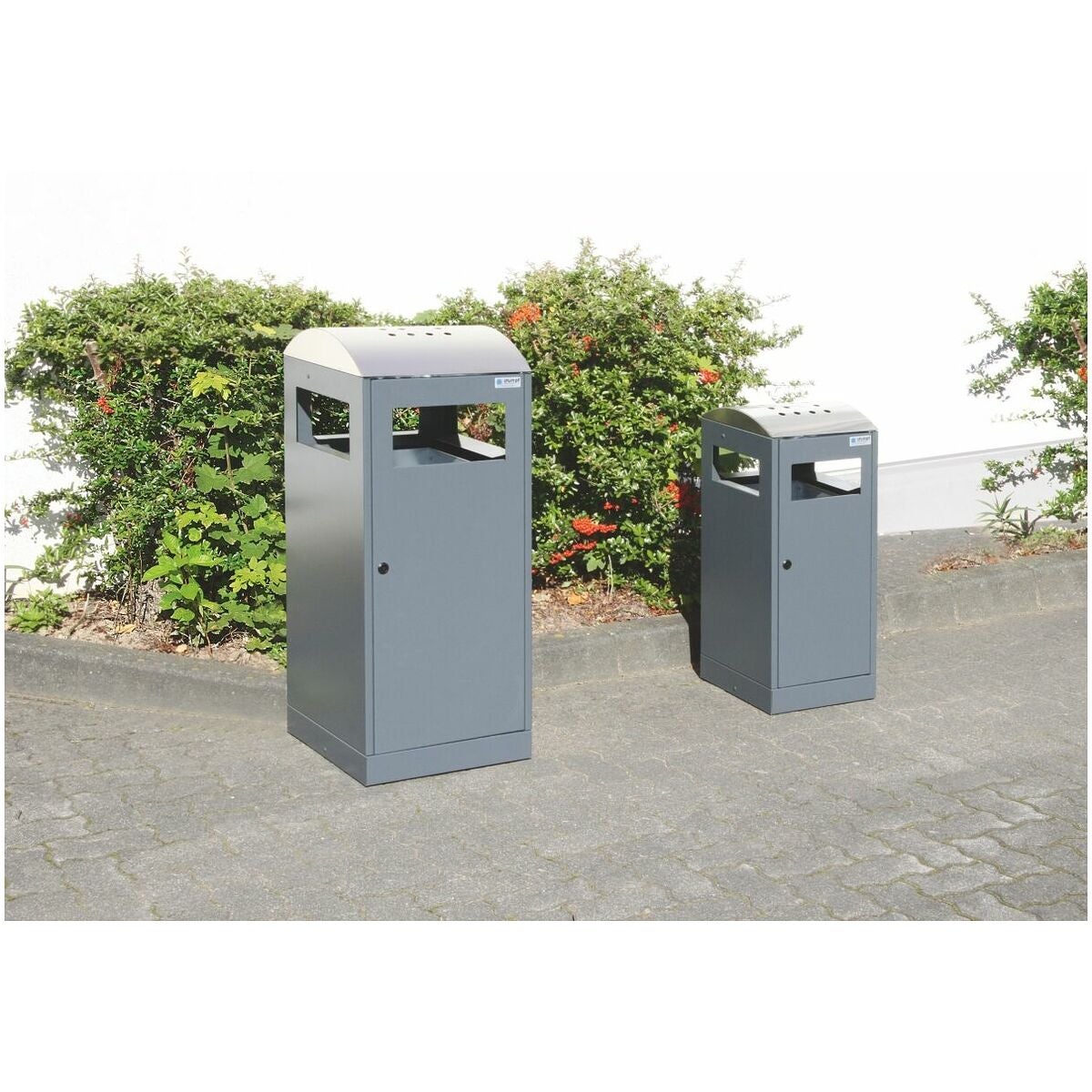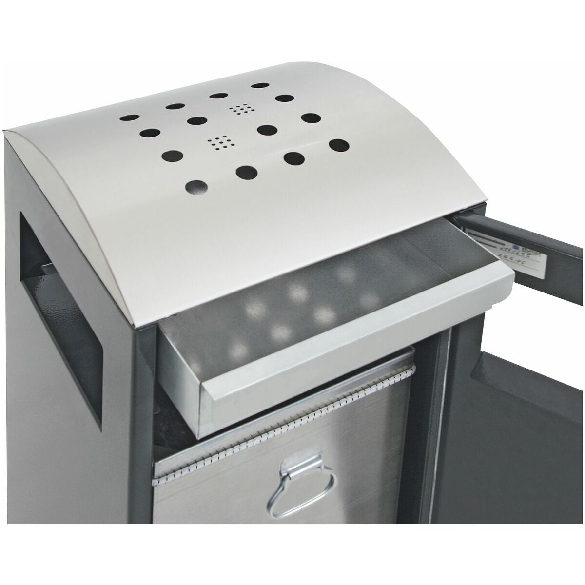 Separat löstagbar askkopp. Galvaniserad innerbehållare som kan tas bort via en låsbar slagdörr på framsidan. Dörren låses med ett fyrkantigt lås.
