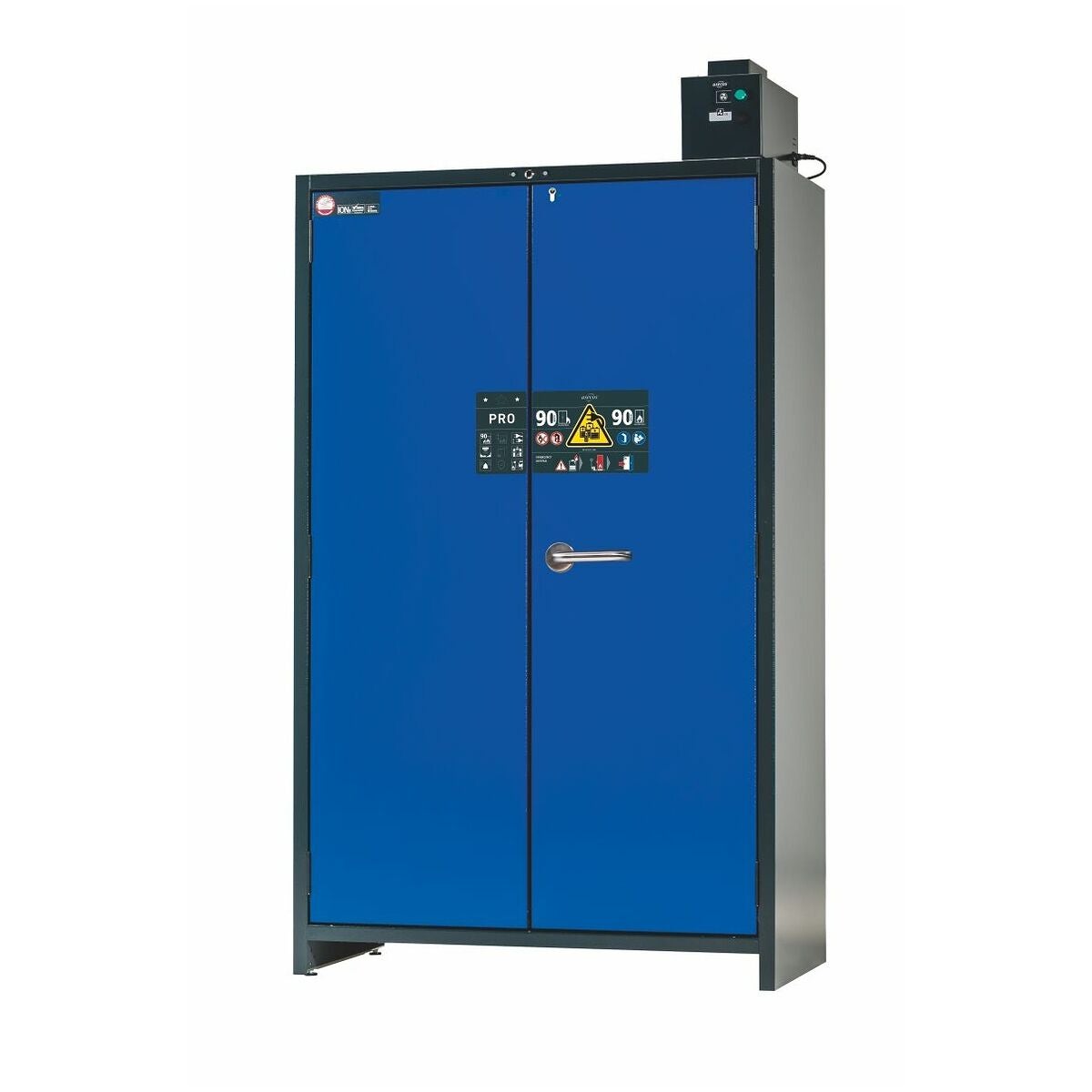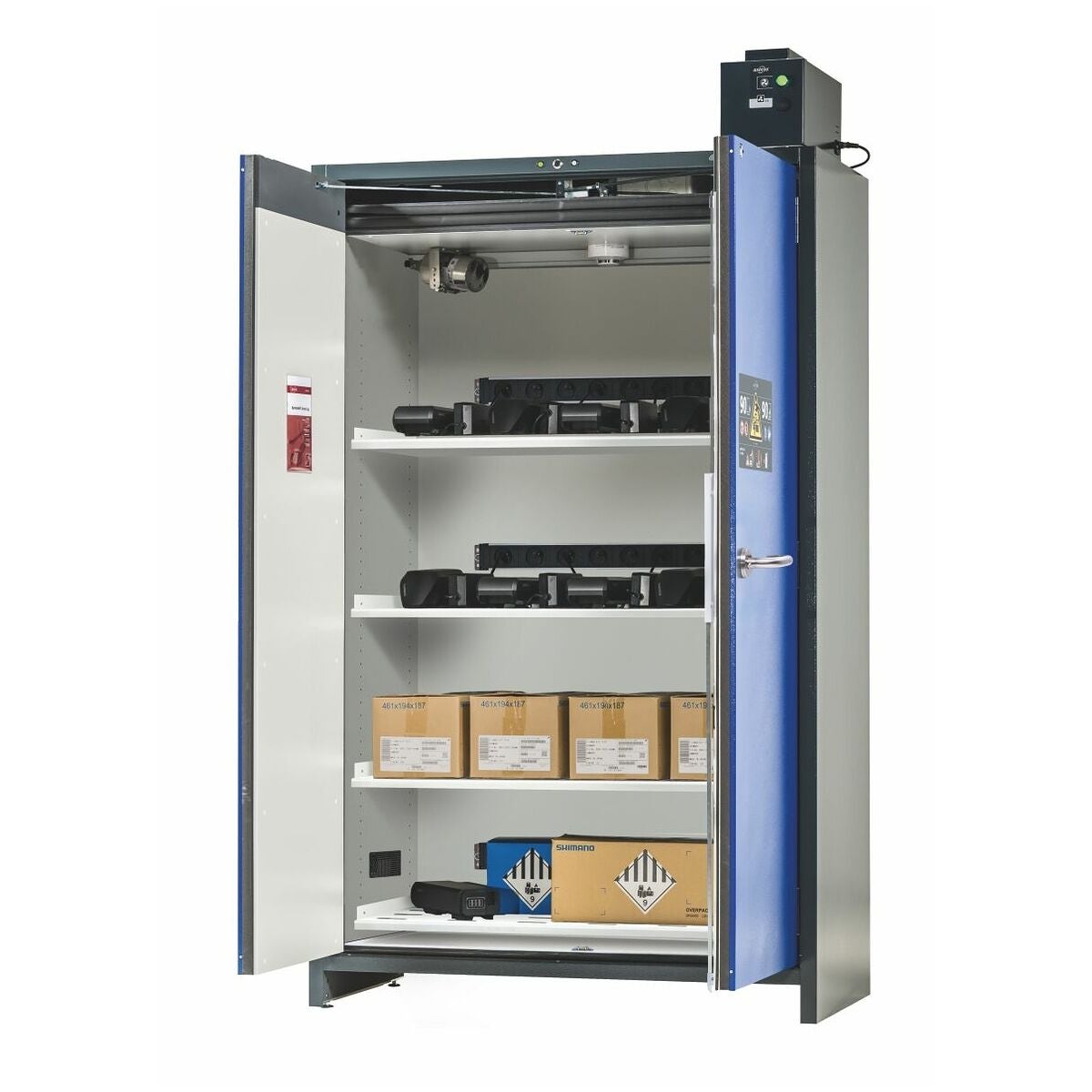 Batteriladdningsskåp för säker laddning och förvaring av litiumjonbatterier. Öppna två skåpdörrar samtidigt med en hand. Ventilationstillsats för att förhindra värmestockning under batteriladdning. Tryckavlastningsöppning i överdelen. Installerat 3-stegs varningssystem inklusive rökdetektor, temperatursensor, optisk och akustisk larmgivning och som tillval tillgänglig brandbekämpningsenhet; löser automatiskt ut vid brand; med stickkontakt för anslutning till elnätet. Eluttagslist med metallhölje och 8 jordade eluttag för varje förvaringsnivå monterad komplett användningsklar inuti skåpet.