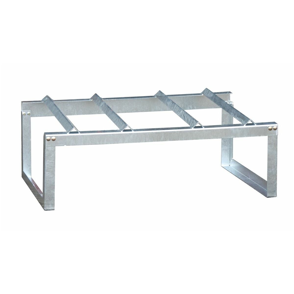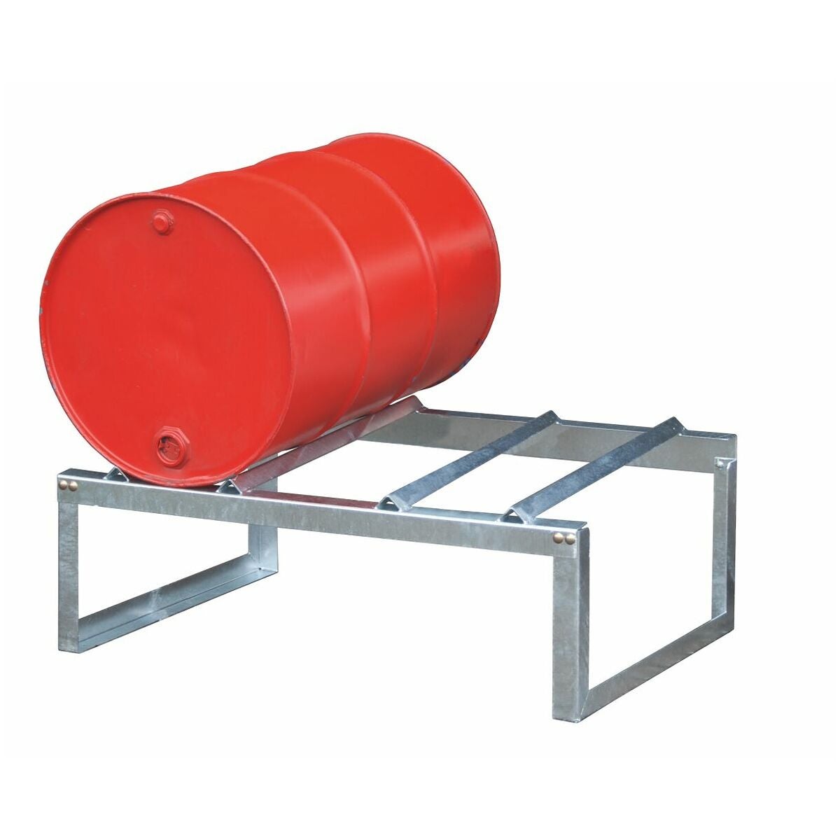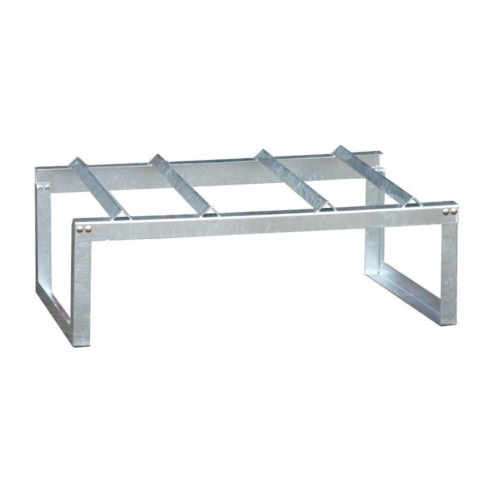 Fatställ av stålplåt för liggande förvaring och för påfyllning av 200-litersfat. För uppställning på uppsamlingstråg med gallerdurk (uppdelad levereras).