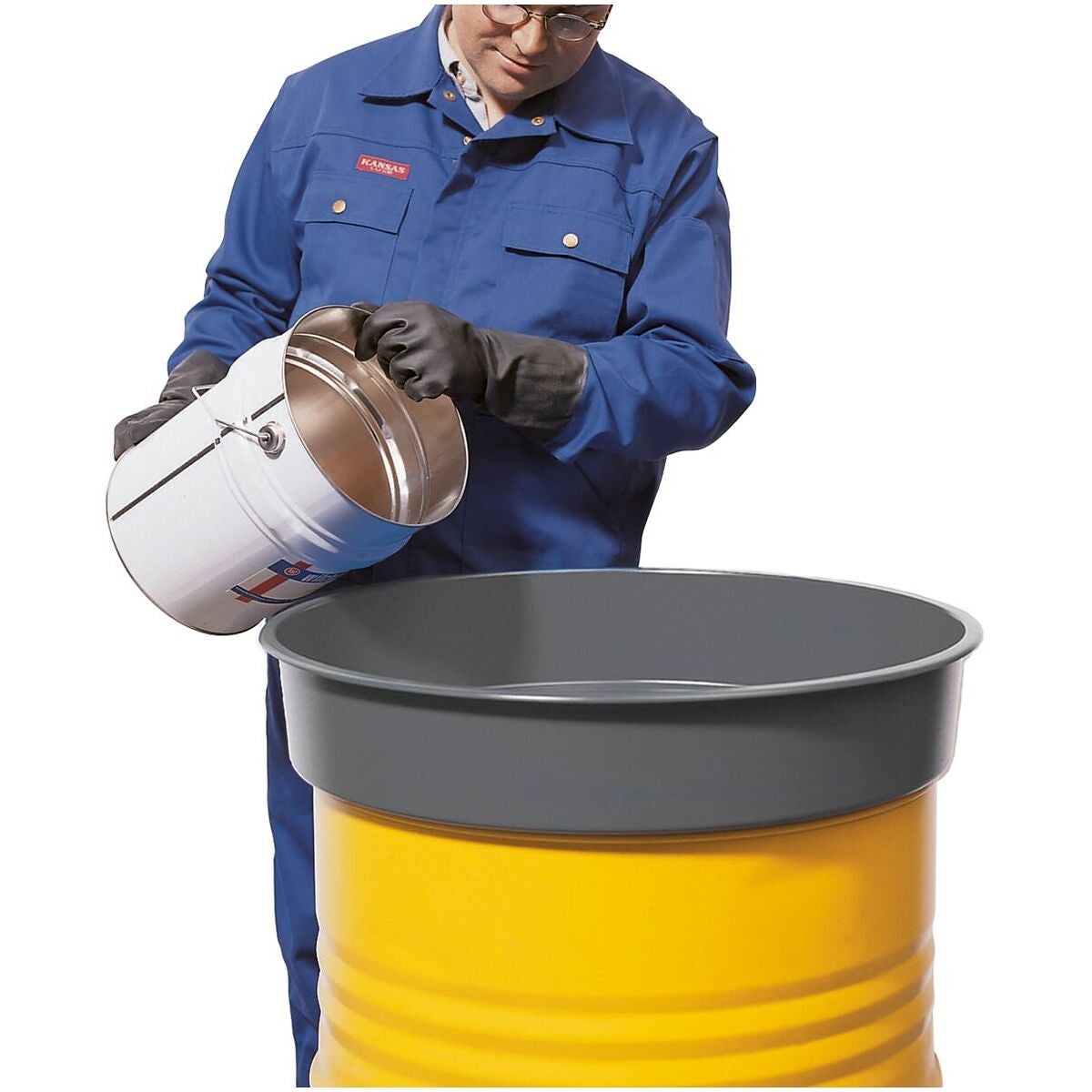 Av stålplåt, lackerad − trafikgrå RAL 7043 pulverlackerad. Påfyllning via fatets 2 tum sprundhål.