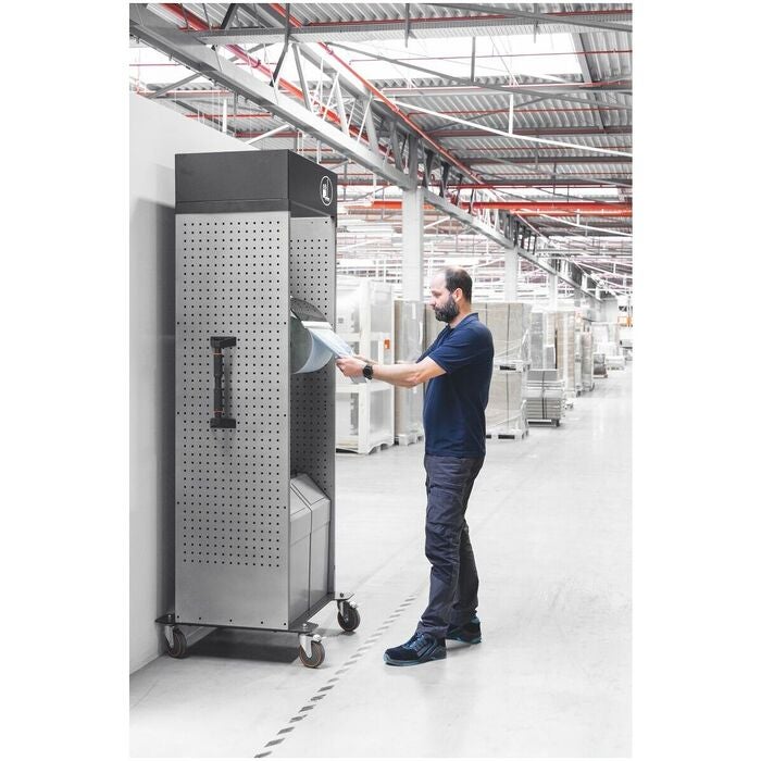 Modulärt rengöringstorn för direkt åtkomst till rengöringsapparater. GARANT Uni Line Cleaning Tower H-form asymmetrisk är komplett utrustat med 2 materialsamlare och GARANT easyFix pappersrullhållare. Materialsamlare kan fästas på perforerad panel via den medföljande GARANT easyFix basplattan.