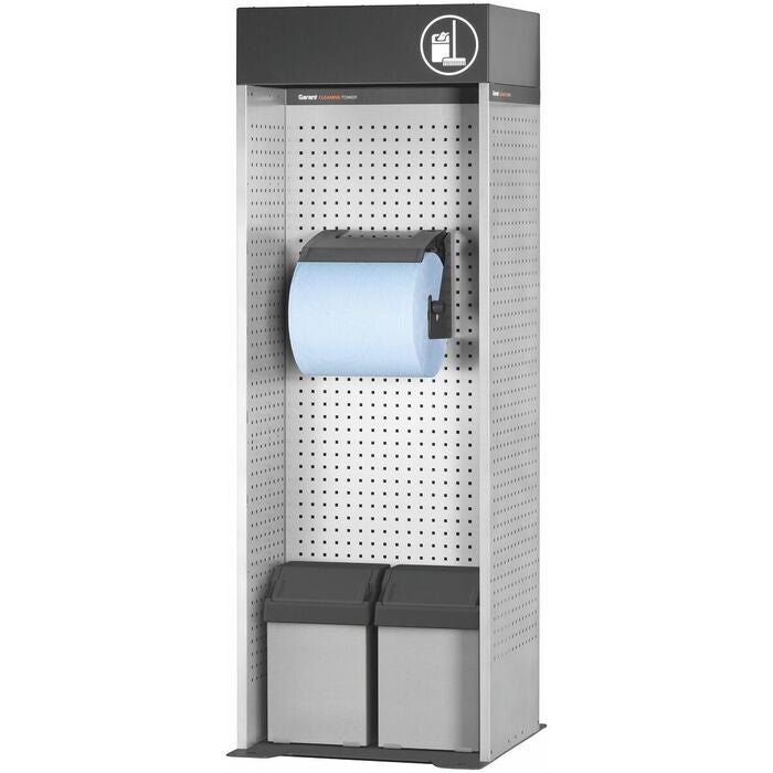 Modulärt rengöringstorn för direkt åtkomst till rengöringsapparater. GARANT Uni Line Cleaning Tower H-form asymmetrisk är komplett utrustat med 2 materialsamlare och GARANT easyFix pappersrullhållare. Materialsamlare kan fästas på perforerad panel via den medföljande GARANT easyFix basplattan.