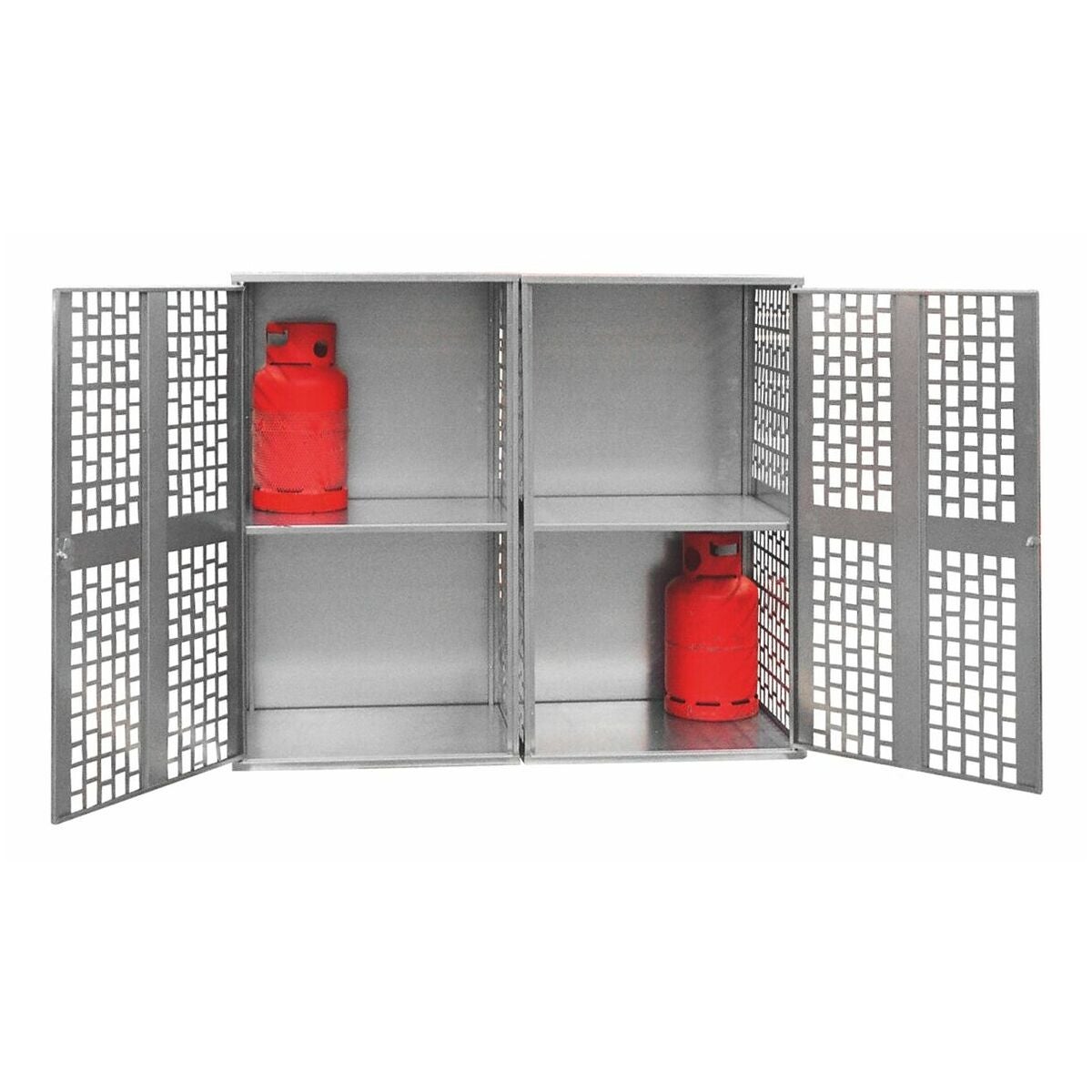 Propangasflaskskåp av förzinkad stålplåt. Självdragsventilation genom perforerde dörrar och sidoväggar, med lås. För förvaring av 11 kg gasflaskor inom- och utomhus, enligt TRGS 510.