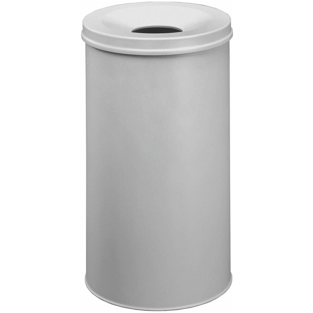 Rund papperskorg med flamsläckande överdel som förebyggande brandskydd. Det självsläckande locket bryter syretillförseln i papperskorgen och kväver flammorna på ett tidigt stadium. Av stål med reptålig epoxidhartsbeläggning.