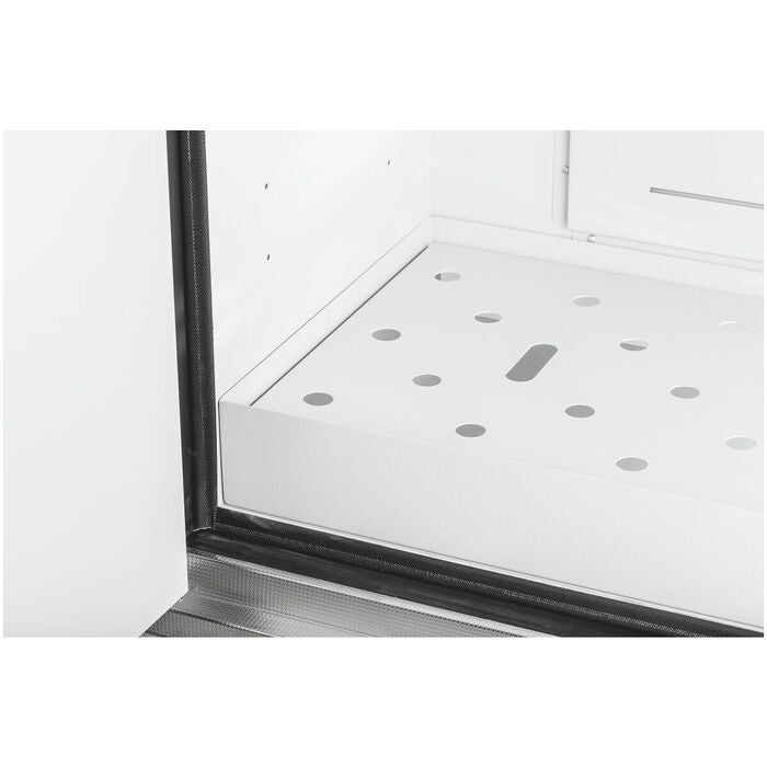 Utvändig stomme av stålplåt, invändig stomme av HPL-belagda skivor. Golvavslutsskena av rostfritt stål. Hyllor som kan justeras på höjden i intervaller om 64 mm.