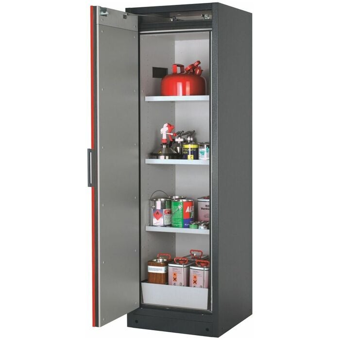 Skåpstomme av stålplåt med integrerat dörrspärrsystem, invändigt med kemikaliebeständig yta.