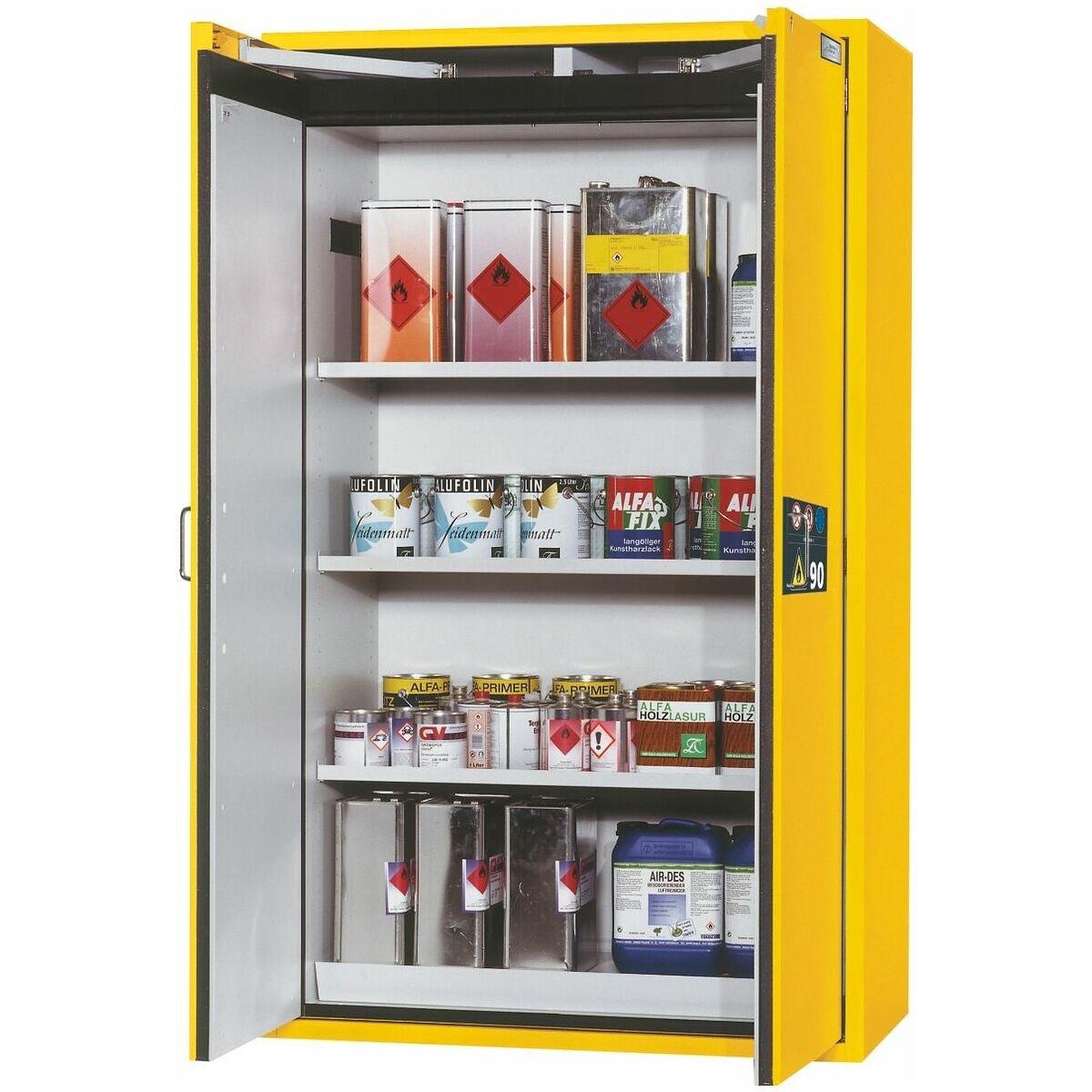 Föreskriftsenlig förvaring av brandfarliga ämnen i arbetslokaler.