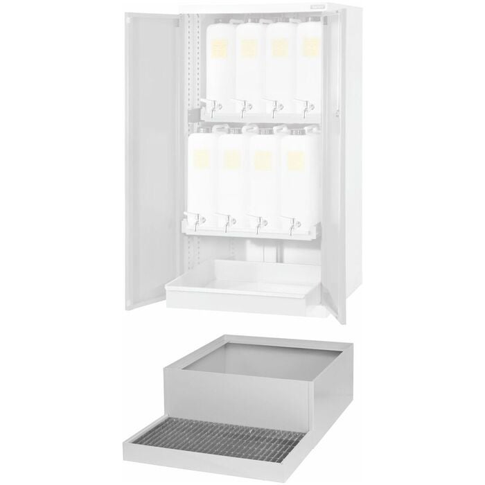Svetsad stålsockel med uppsamlingstråg och galler (maskor 25×76 mm). Uppsamlingstråget är olje- och vattentätt svetsat. Förzinkat galler.