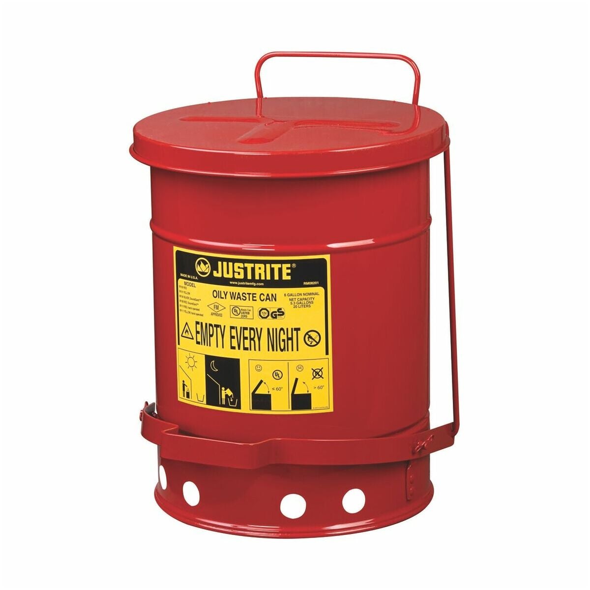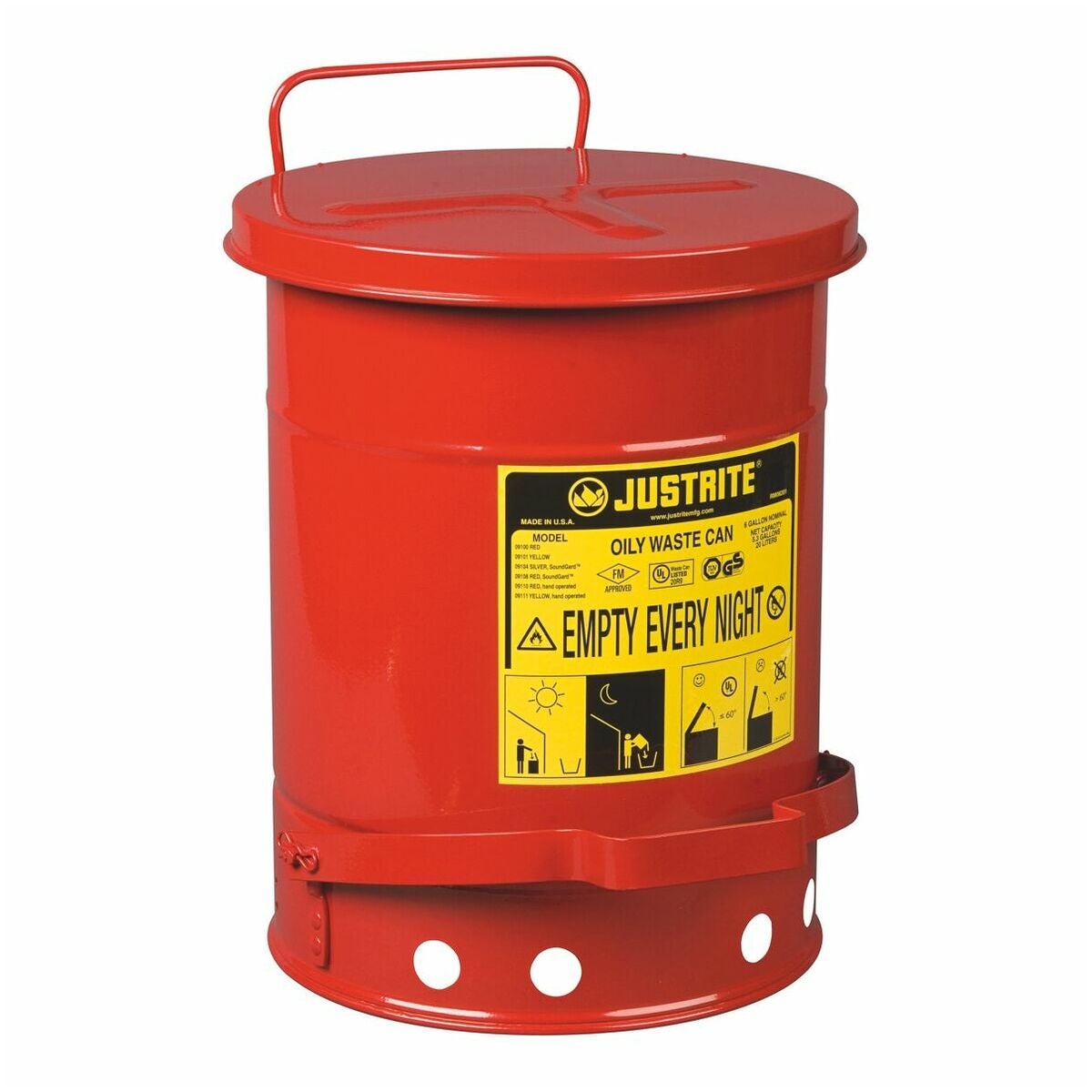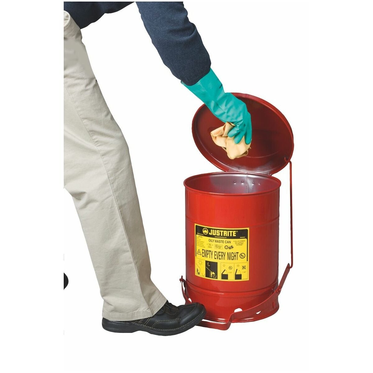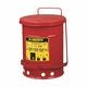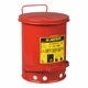 Säkerhetsbehållare i stålplåt med fotmanövrering för omhändertagande av oljeindränkta trasor och undvikande av bränder orsakade av gnistor eller självantändning. Locket är självstängande för att isolera innehållet från brandkällor och för att begränsa tillgängligt syre. Rund konstruktion och upphöjd botten möjliggör bra luftcirkulation utanför behållaren, vilket fördelar värmen bättre och minskar ansamling av fukt och rost.