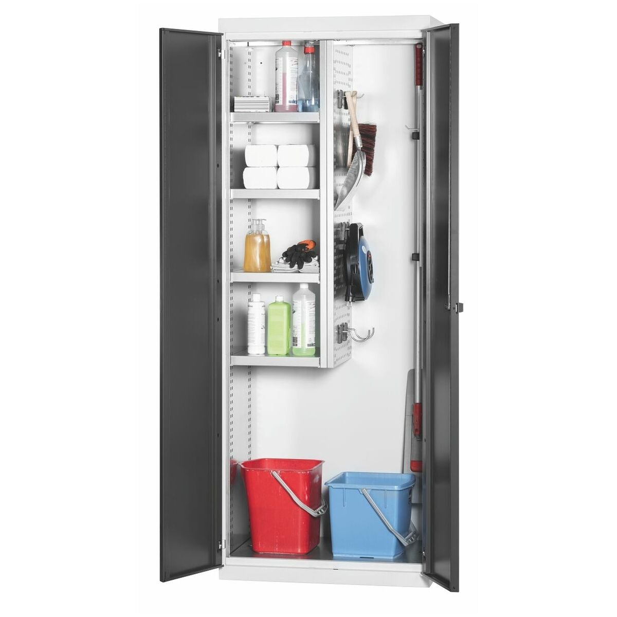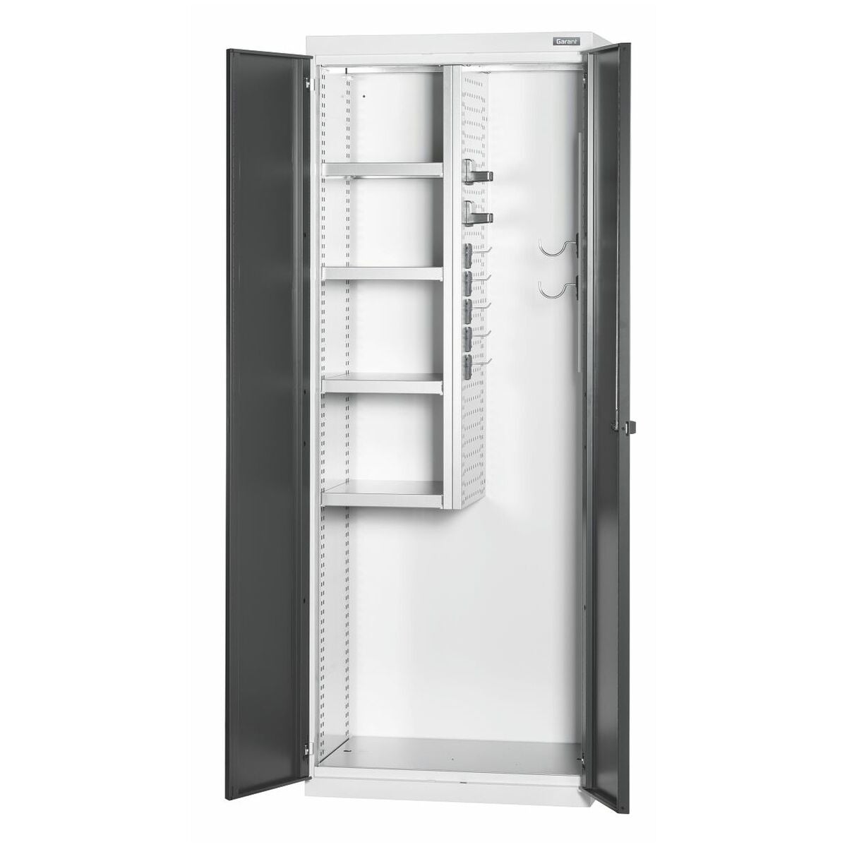 Universalskåp för förvaring av rengöringsmedel, städredskap och kläder. Förzinkade hyllplan kan monteras i 25 mm raster. Slagdörrarna är förstärkta på insidan och kan låsas med 2K-Haptoprene-skjuthandtag med stiftcylinderlås. Nivelleringssockel med 4 individuellt inställbara fötter för utjämning av ojämnheter i underlaget. Hyllplanens bärförmåga 25 kg. Perforering 9×9 mm i 37 mm-raster i indelningshurtsen, lämplig för infästning av GARANT easyFix krokar och hållare (i grupp 95).