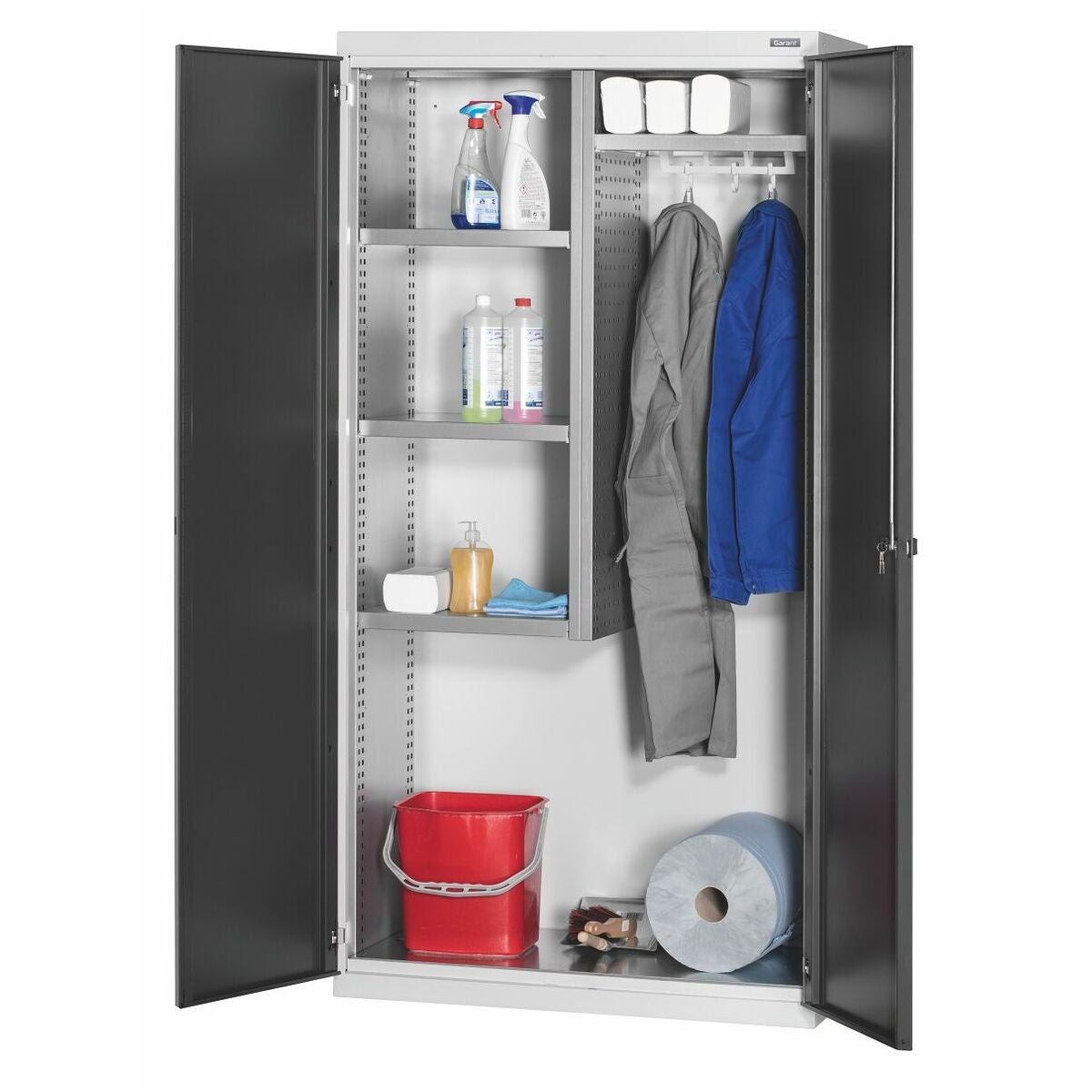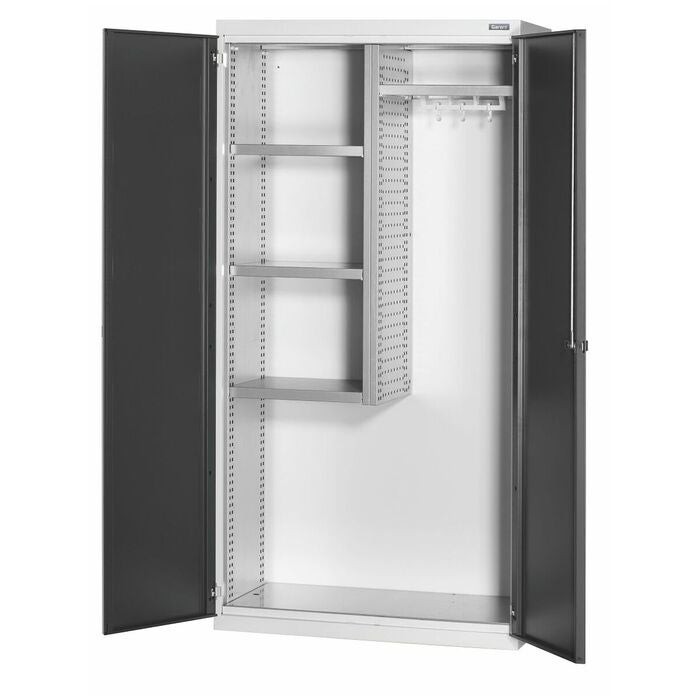 Universalskåp för förvaring av rengöringsmedel, städredskap och kläder. Förzinkade hyllplan kan monteras i 25 mm raster. Slagdörrarna är förstärkta på insidan och kan låsas med 2K-Haptoprene-skjuthandtag med stiftcylinderlås. Nivelleringssockel med 4 individuellt inställbara fötter för utjämning av ojämnheter i underlaget. Hyllplanens bärförmåga 25 kg. Perforering 9×9 mm i 37 mm-raster i indelningshurtsen, lämplig för infästning av GARANT easyFix krokar och hållare (i grupp 95).