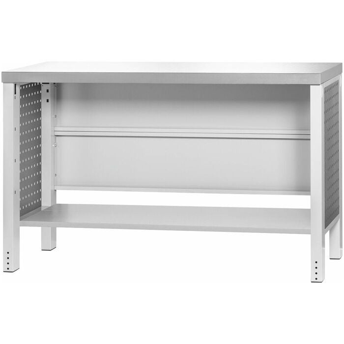 GridLine vario arbetsbänk bestående av höjdjusterbara stödben, hyllplan och bakvägg av stålplåt samt sidoinklädnad med fyrklantperforering. Eterluxarbetsskiva tjocklek 50 mm, slitstark, resistent mot olja, fett, svaga syror och lutar.