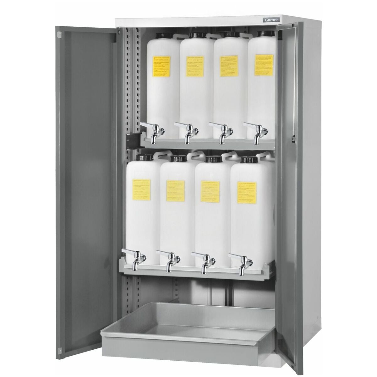 Vätskeskåp med plastdunkar