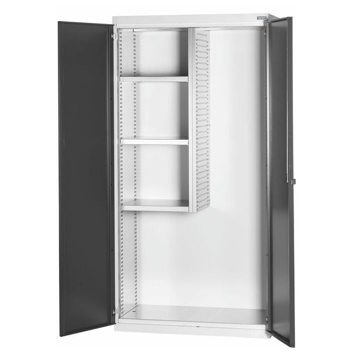 Utrustat skåp i 40x20G med skiljevägg. Hyllor kan monteras i 25 mm raster. Slagdörrarna är förstärkta på insidan och kan låsas med 2K-Haptoprene-skjuthandtag med stiftcylinderlås.