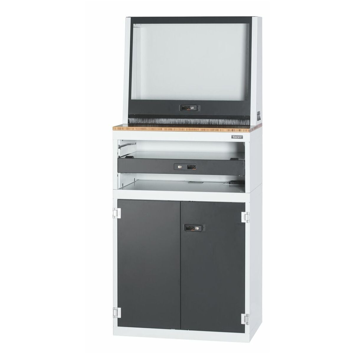 TFT-skärmhölje för platta bildskärmar med fast kabelförvaringsgack. Datorhurts med fläkt i hurtslocket och ett flyttbart hyllplan. Låsbar tangentbordslåda med handledsstöd av bambu, höjdjusterbar i 3 steg med 60 mm raster. Tangentbordslådan snäpper fast i ändläget. Upplagsskiva av bambu.