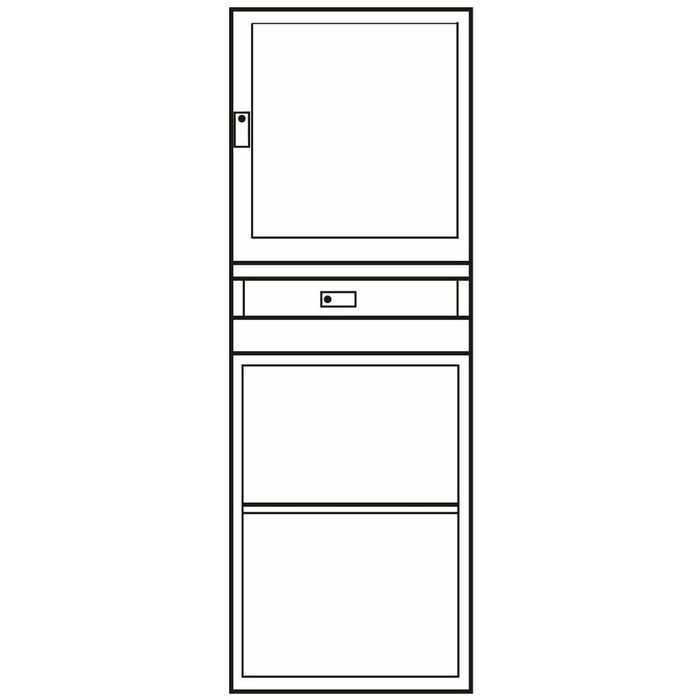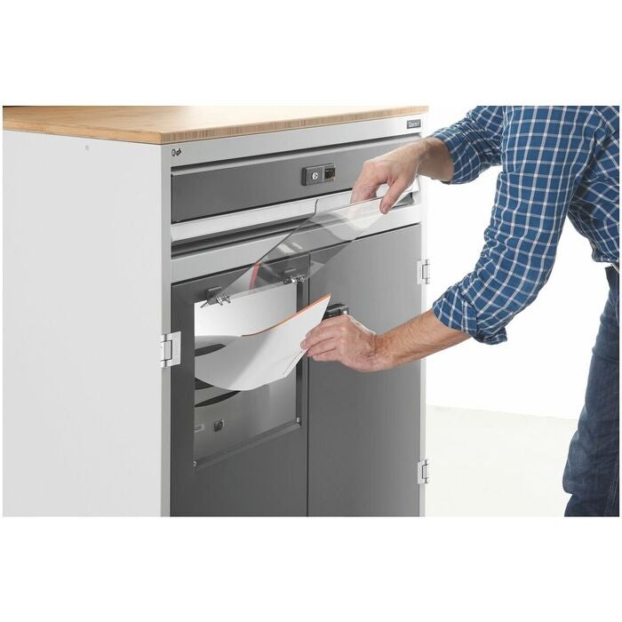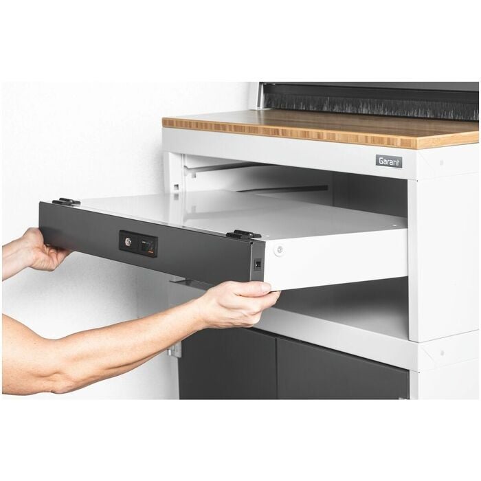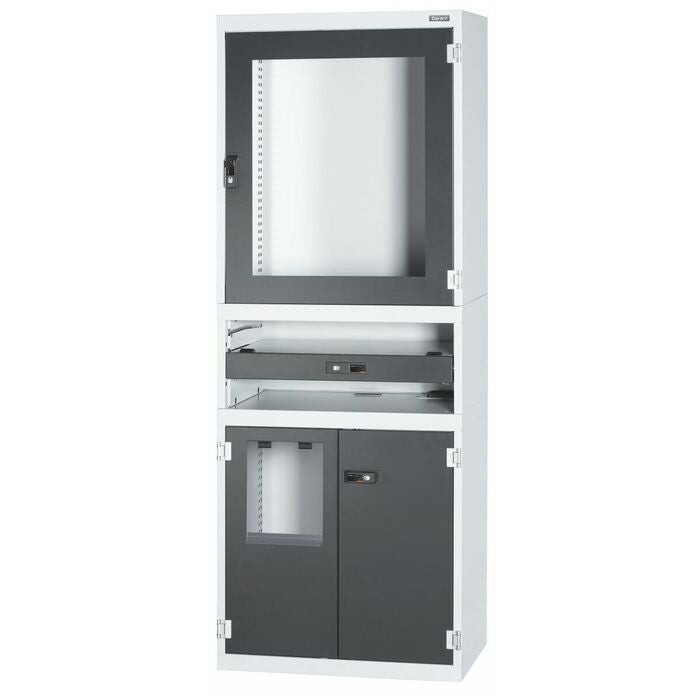 Datorskåp med fläkt och en förzinkad hylla med ställbar höjd och kabelgenomföringar som ger en överskådlig kabeldragning. Alla lås har samma låsegenskaper.