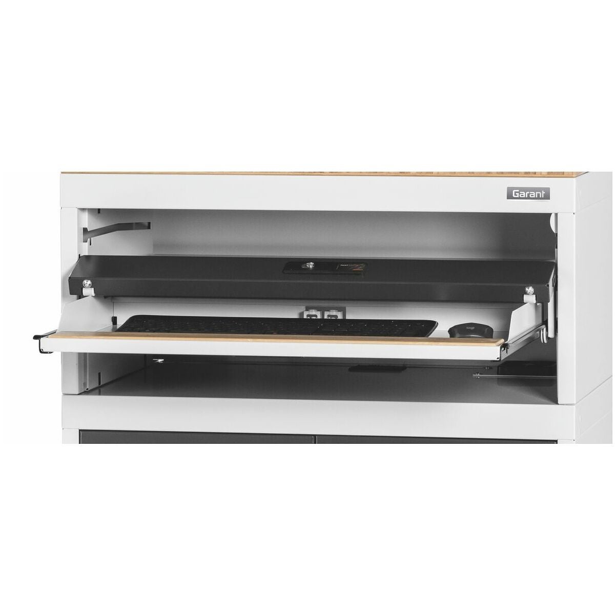 Tangentbordslåda snäpper fast i ändläget. Inställbar i 3 höjdlägen med 60 mm raster (1058 / 1118 / 1178 mm), låsbar, med handledsstöd av bambu och dragavlastning.