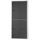 Dörrar med dämpade anslag. Plastglidstöd i golvgruppen. Sockelhöjd 80 mm. Lockhöjd 40 mm. Lock och sockel sitter jäms med dörrarna. Monterade svängdörrar. Dörrstoppen kan flyttas från höger till vänster med några få handgrepp. Med högvärdigt cylinderlås i skjuthandtaget.
