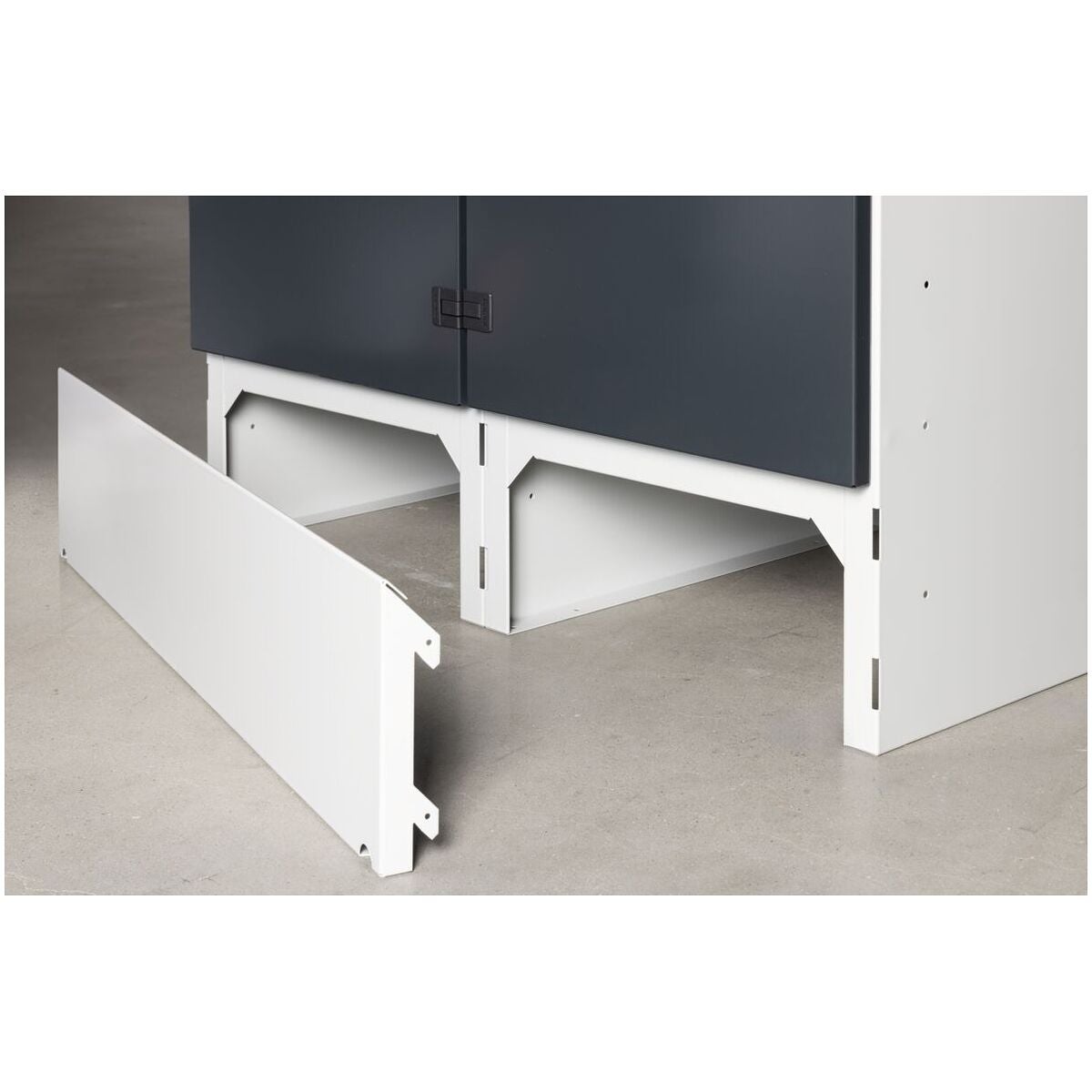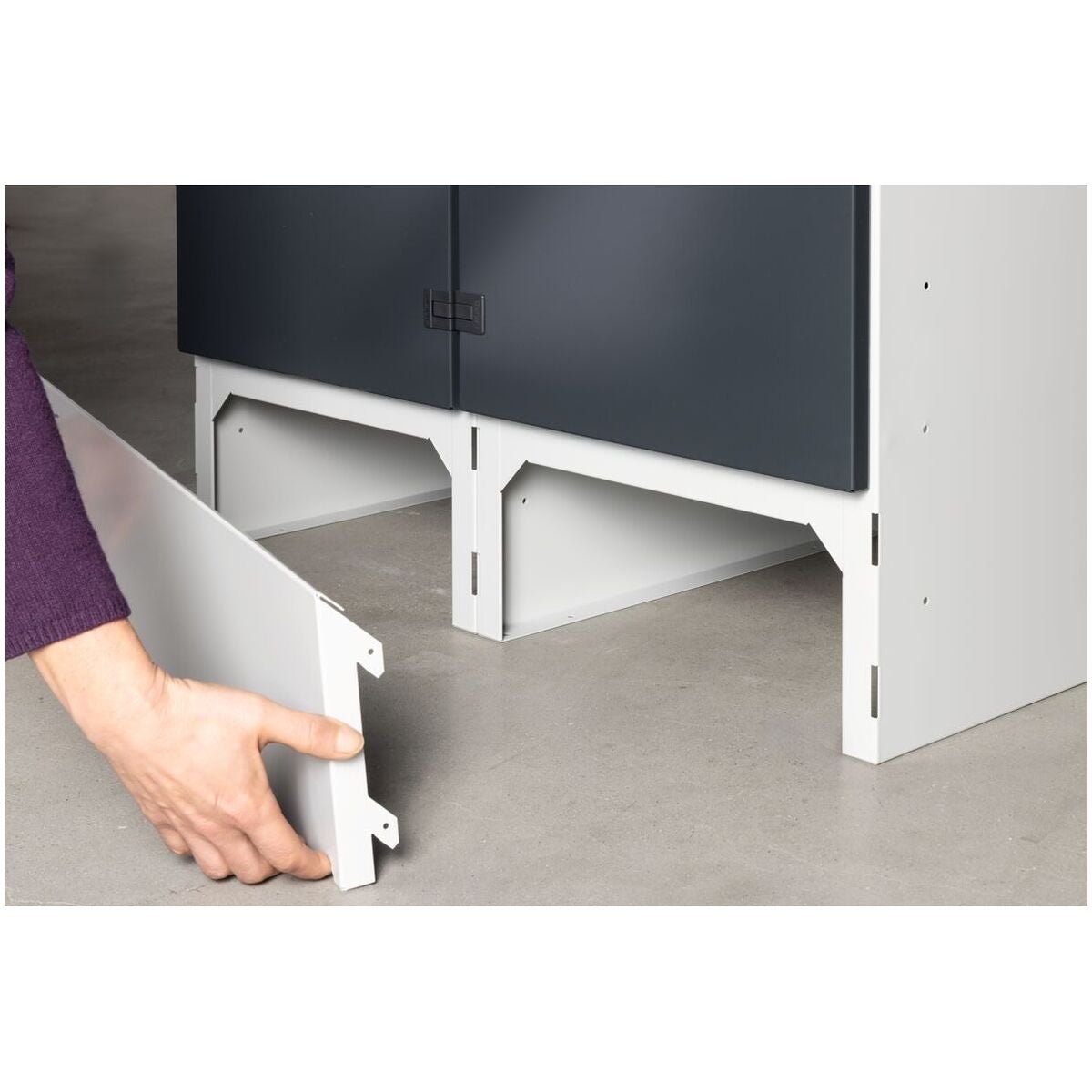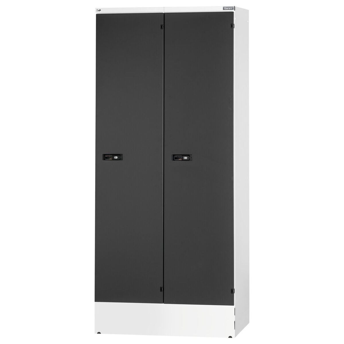Garderobskåpets stomme har ett plastglidstöd i golvgruppen samt en avtagbar sockel på framsidan. Bakväggar med luftslitsar, dörrar med handdukshållare och namnskylt. Dörrstoppen kan flyttas från höger till vänster med några få handgrepp.