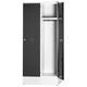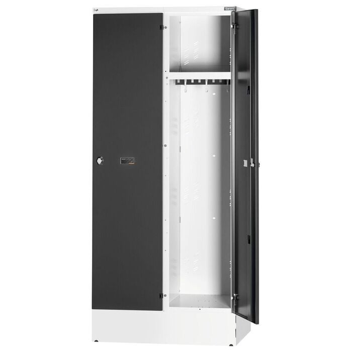 Garderobskåpets stomme har ett plastglidstöd i golvgruppen samt en avtagbar sockel på framsidan. Bakväggar med luftslitsar, dörrar med handdukshållare och namnskylt. Dörrstoppen kan flyttas från höger till vänster med några få handgrepp.