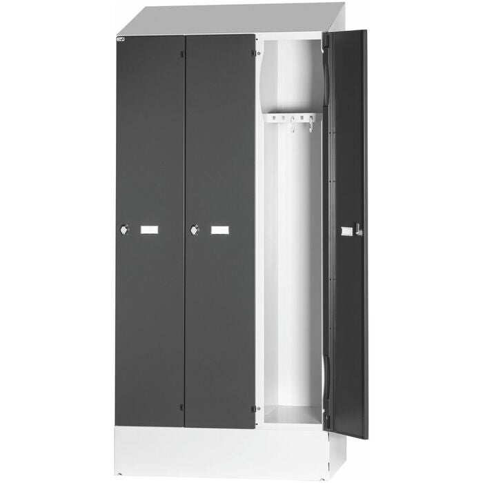 Dörrar med dämpade anslag. Stommen har ett snedtak, plastglidstöd i golvgruppen samt en avtagbar sockel på framsidan. En fast hylla med två klädkrokar per avdelning. Den speciella konstruktionen medger förvaring av integralhjälmar trots en avdelningsbredd på endast 300 mm (patentsökt).