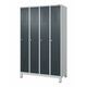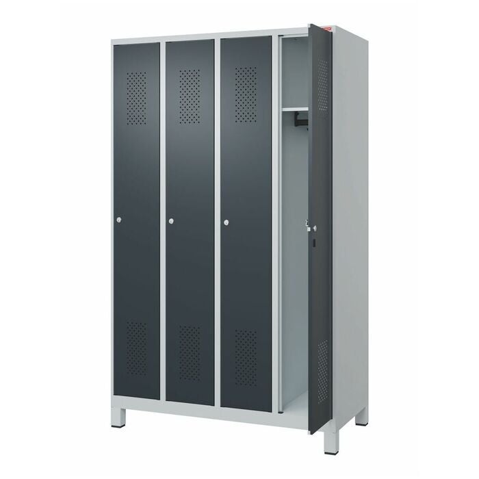 Garderobskåp med sektionsbredd 300 mm med fastsvetsad hatthylla. Klädstången har 3 skjutbara krokar. Dörr med rutmönstrad ventilationsperforering.
