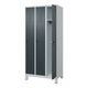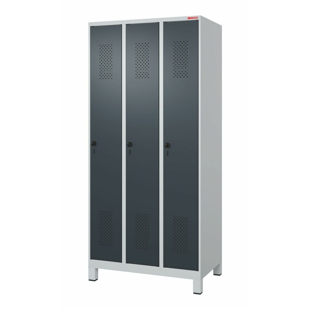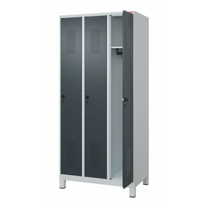 Garderobskåp med sektionsbredd 300 mm med fastsvetsad hatthylla. Klädstången har 3 skjutbara krokar. Dörr med rutmönstrad ventilationsperforering.