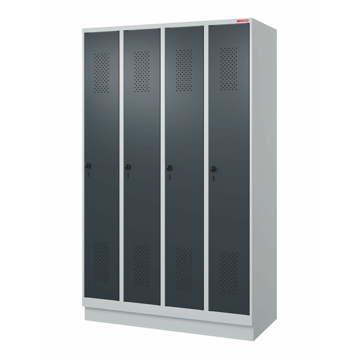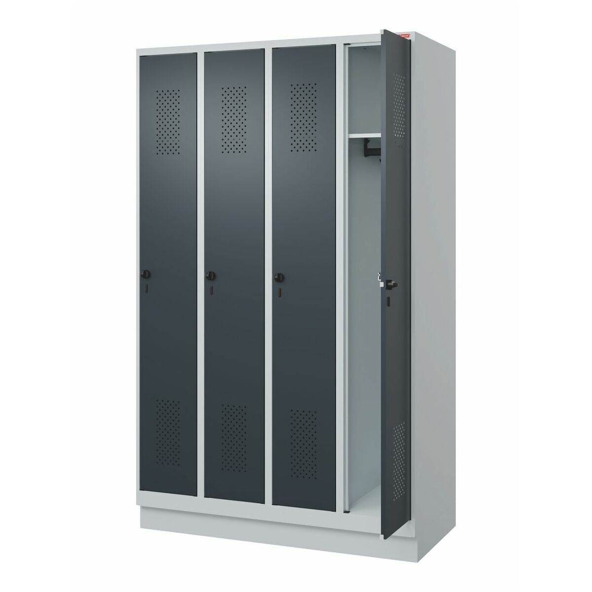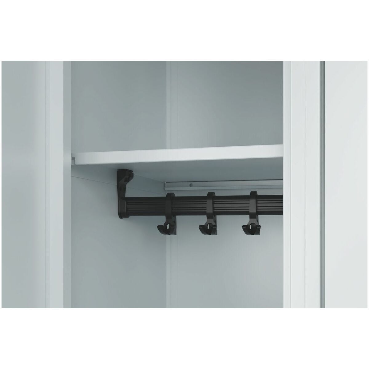 Garderobskåp med sektionsbredd 300 mm med fastsvetsad hatthylla. Klädstången har 3 skjutbara krokar. Dörr med rutmönstrad ventilationsperforering.