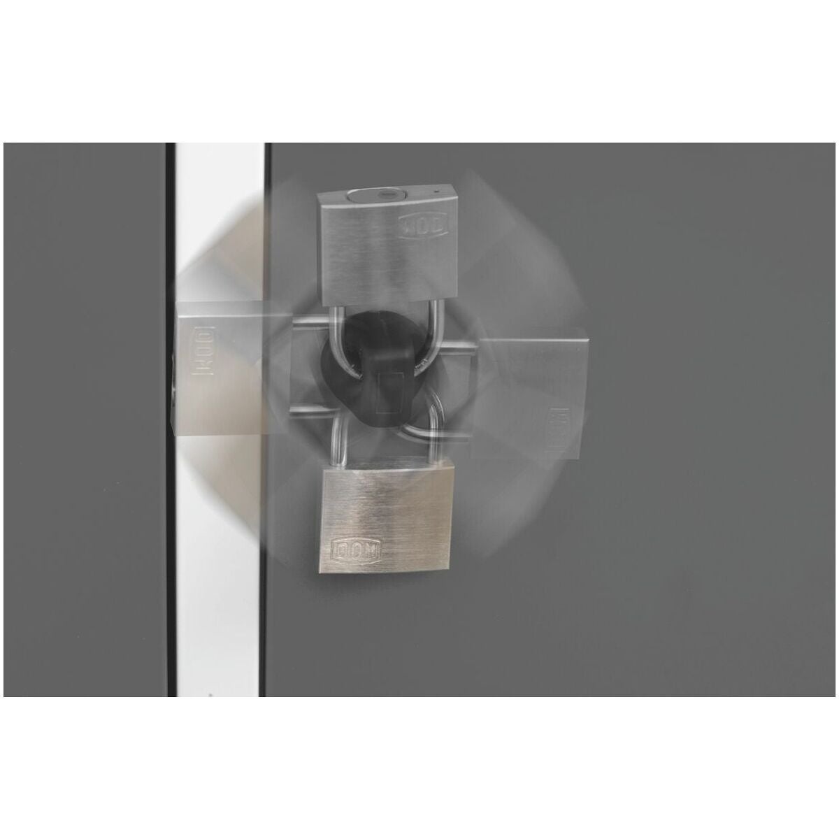 Med låsklinka, låsbar med hänglås (ingår inte i leveranssomfattningen).