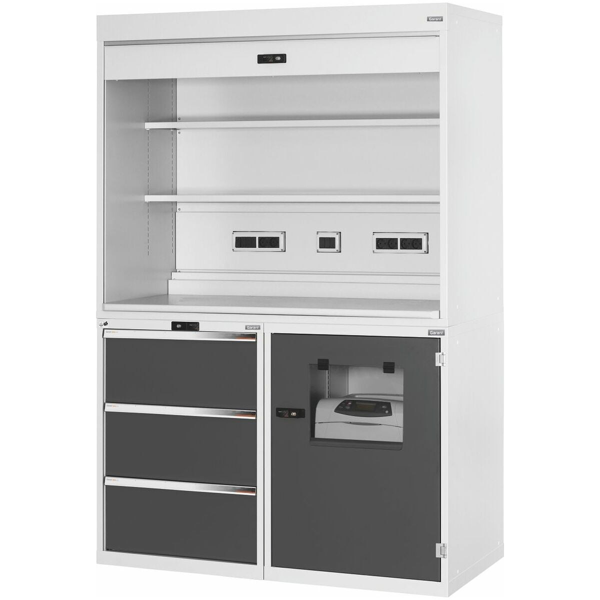 Underbyggnad med datorskåp med låsbar slagdörr med skrivarlucka. Slagdörrskåp med utdragshylla, effektiv bredd 580 mm, effektivt djup 480 mm. I slagdörrskåpet finns en grenlåda med 3 uttag 250 V / 16 A och strömbrytare.