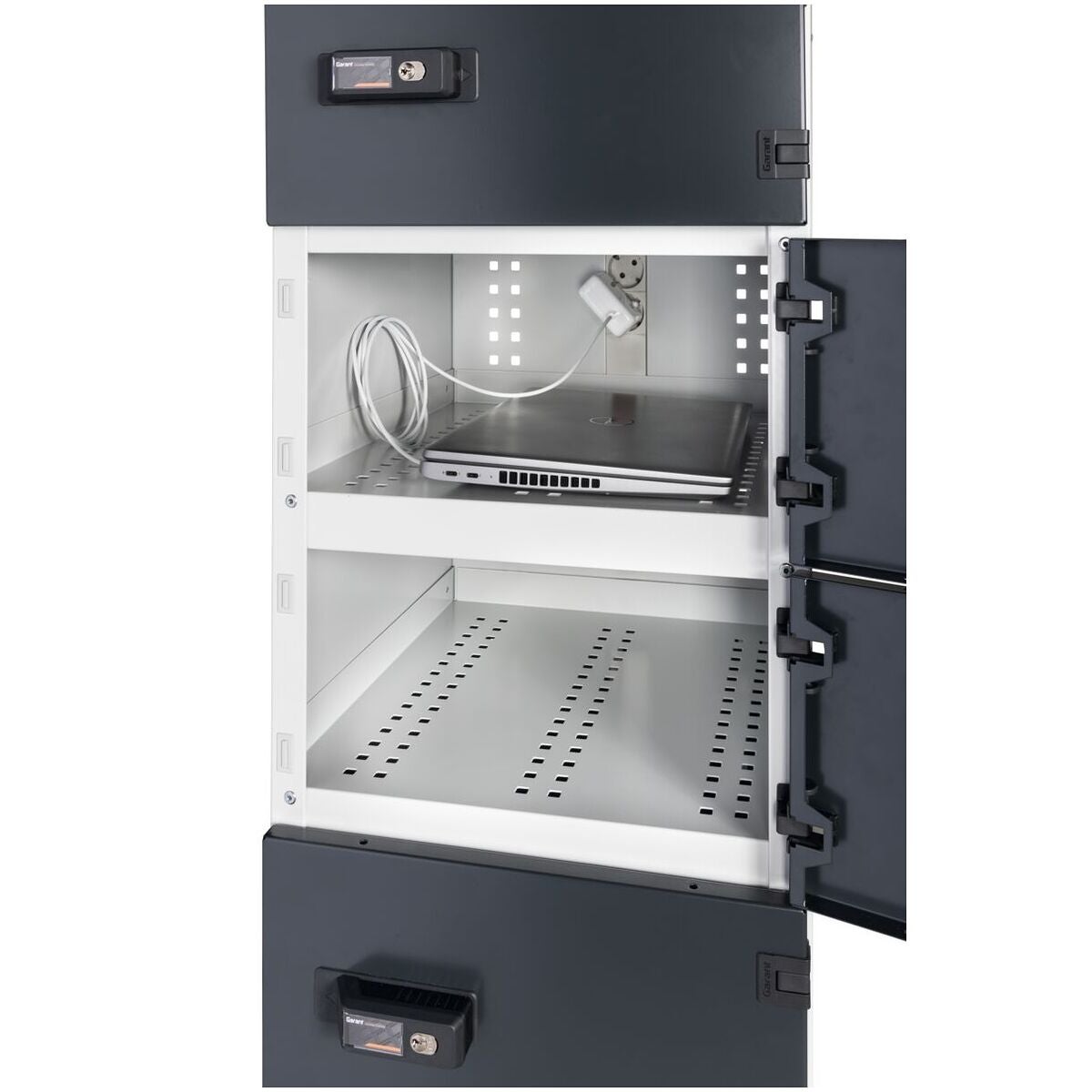 Laptop- / mobiltelefonskåp med 9 individuellt låsbara fack. Det finns två 230 V AC-anslutningar med 2 typ F-uttag per fack. På baksidan finns strömanslutningen med 1,5 m lång kabel, kontakt i tyskt utförande av typ F. Bakpanel med □ 9 x 9 mm i ett 37 mm-raster för fastsättning av GARANT easyFix krokar och hållare. Hyllor och skåpbotten med perforeringar för ventilation.