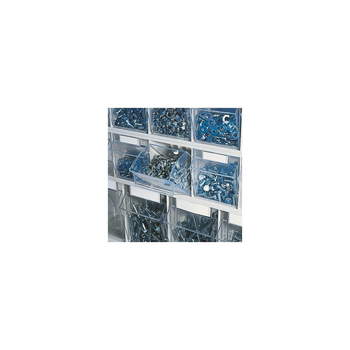 Transparenta lådor av genomskinlig ABS-plast för dammfri lagring. Förvarade föremål fås ut genom att man tippar den genomskinliga lådan. För monteringsändamål kan lådor tas ut och staplas på varandra.