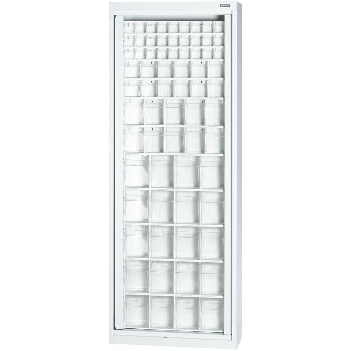 Transparenta lådor av genomskinlig ABS-plast för dammfri lagring. Förvarade föremål fås ut genom att man tippar den genomskinliga lådan. För monteringsändamål kan lådor tas ut och staplas på varandra.