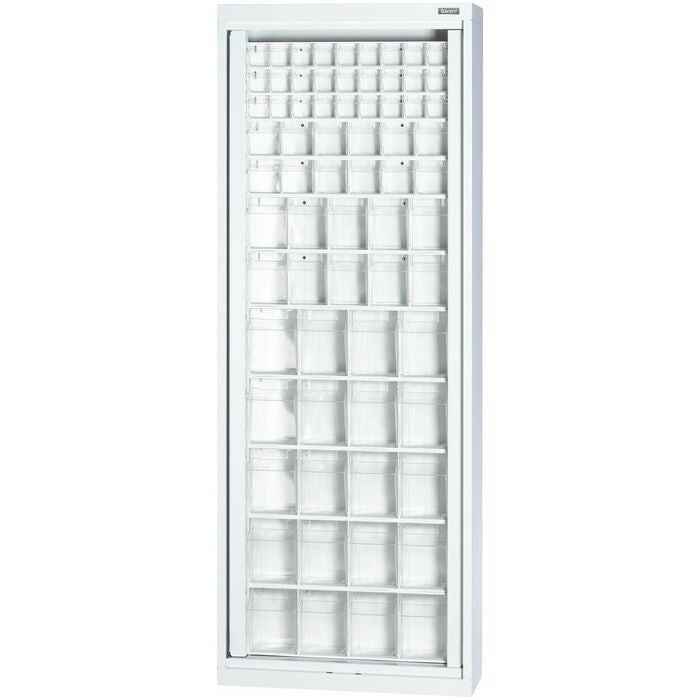 antal transparenta lådor (BxDxH): 27 st 50×42×46 mm 12 st 80×63×70 mm; 10 st 100×97×109 mm; 20 st 175×128×128x133 mm