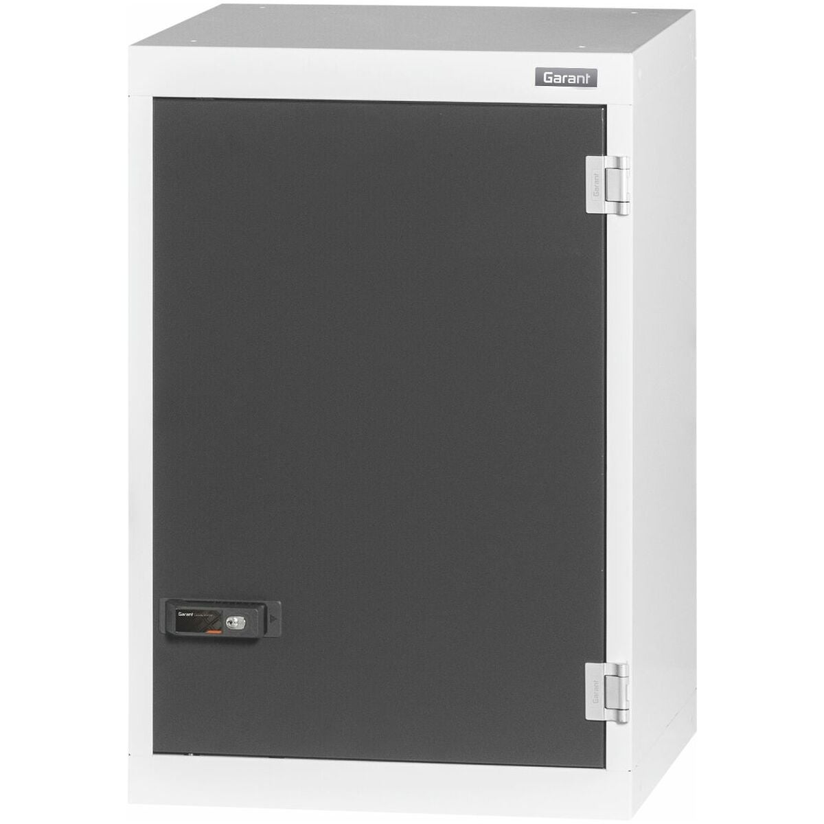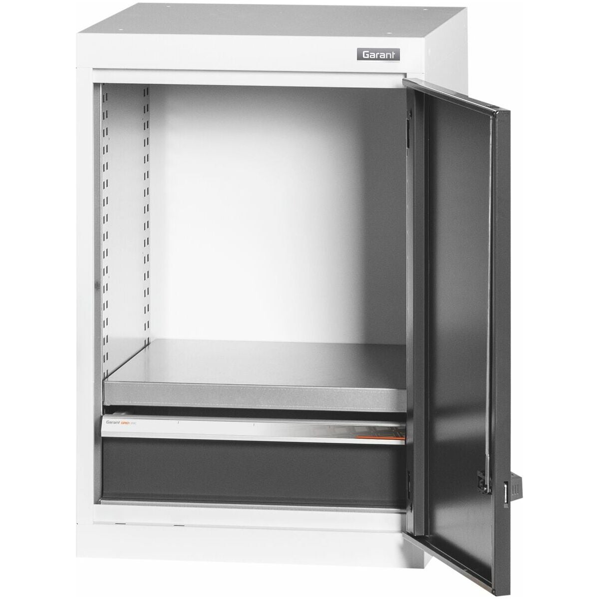 Utrustat skåp i 20×20G, med utdragslådor 16×16G. Hyllor kan monteras i 25 mm raster. Slagdörrarna är förstärkta på insidan och kan låsas med 2K-Haptoprene-skjuthandtag med stiftcylinderlås.