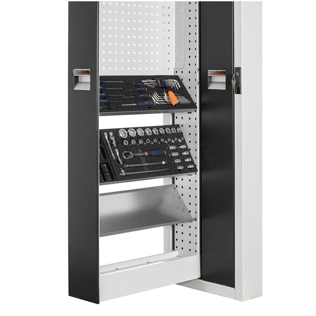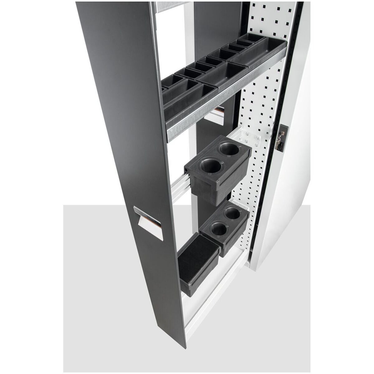 Utdragsramarna har ett perforeringsraster med □ 9×9 mm i 37 mm-raster för fastsättning av verktygshållare, hyllplanstråg och perforerade panelter. Vertikalskåpen är förberedda för golv- och väggmontering och måste ovillkorligen säkras mot vältning.