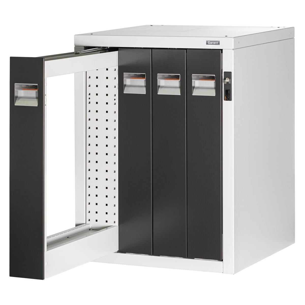 Utdragsramarna har ett perforeringsraster med □ 9×9 mm i 37 mm-raster för fastsättning av verktygshållare, hyllplanstråg och perforerade panelter. Vertikalskåpen är förberedda för golv- och väggmontering och måste ovillkorligen säkras mot vältning.