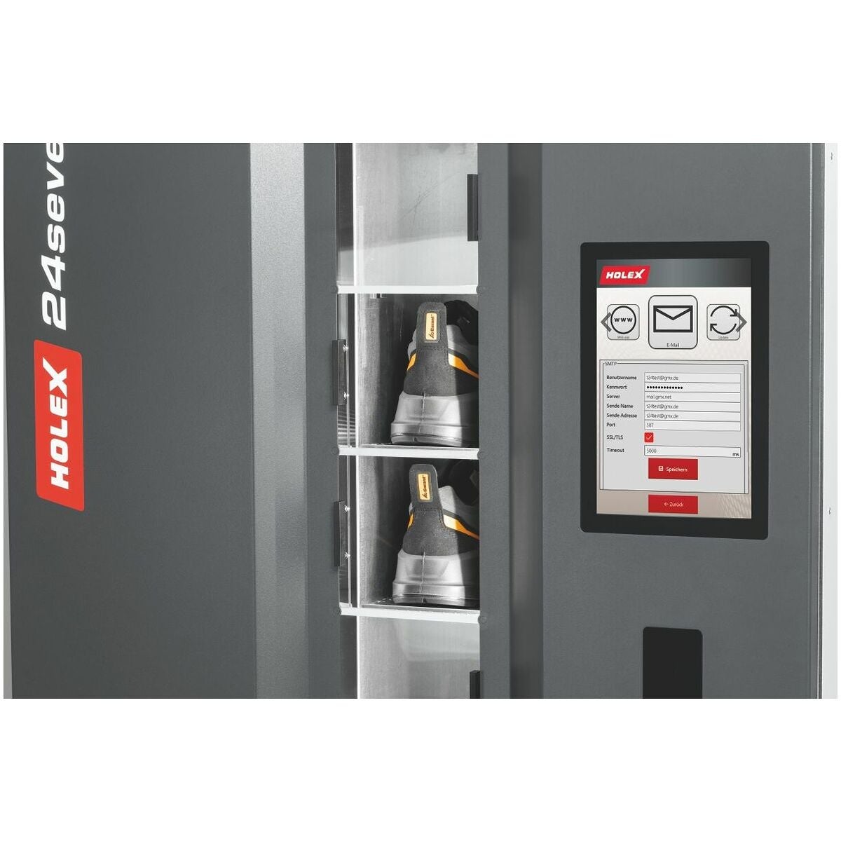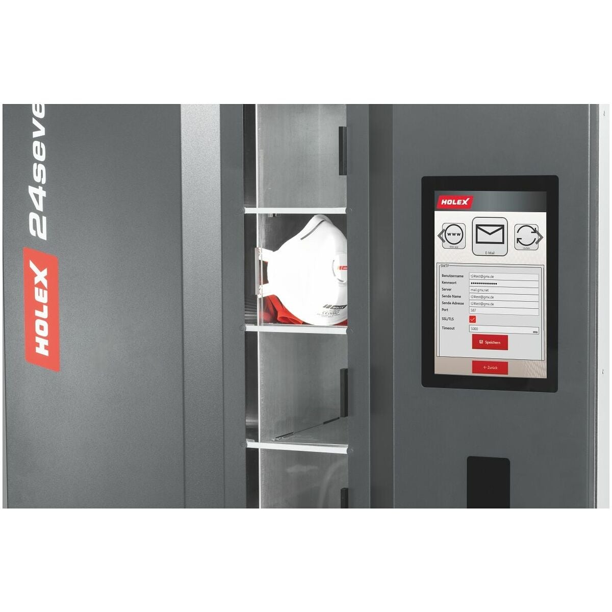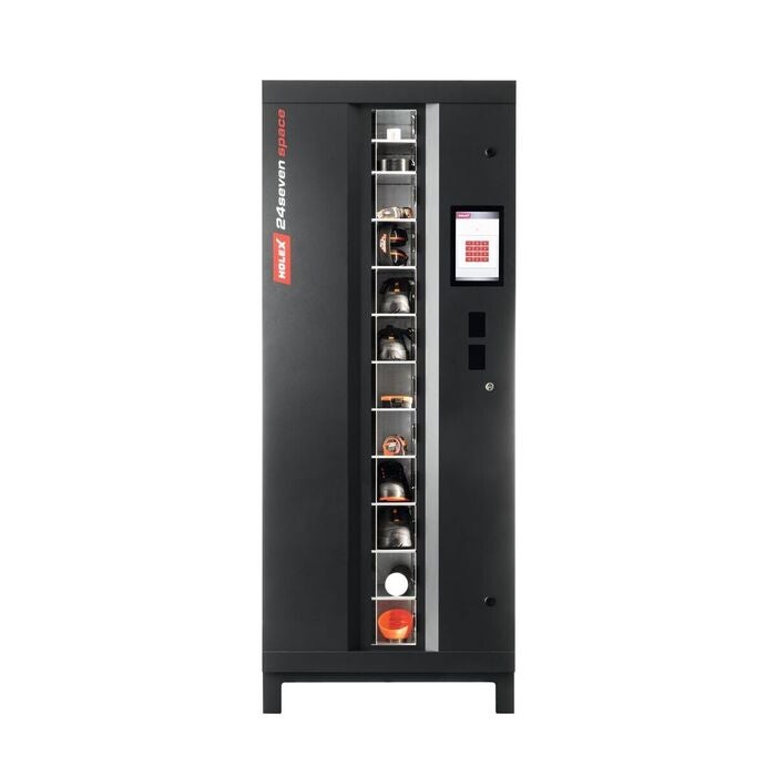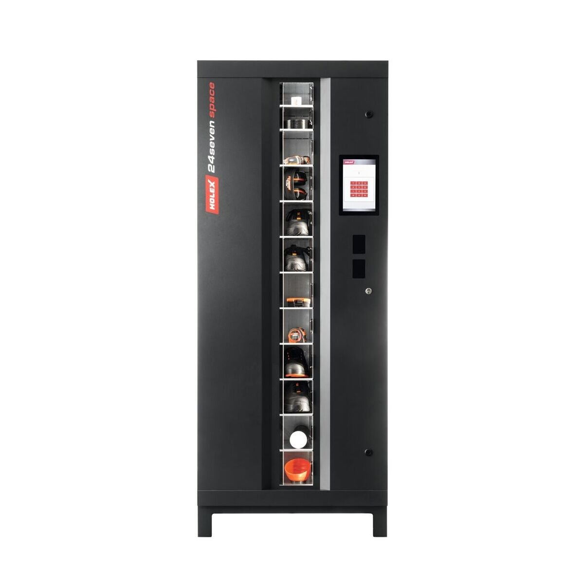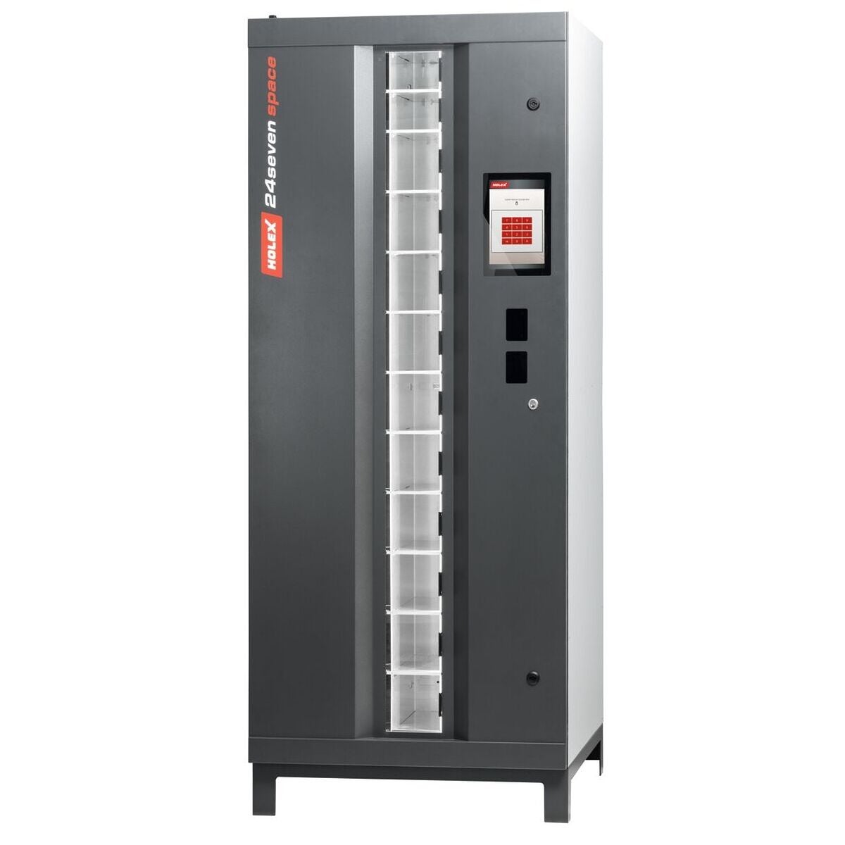 HOLEX varuutlämningssystem i varianterna FLEX och SPACE i modern industridesign. Hölje med robust ram, inklätt med alu-cobondplattor. Front av högklassig svetsad plåtkonstruktion med självöppnande skjutdörrar av stabilt plexiglas.