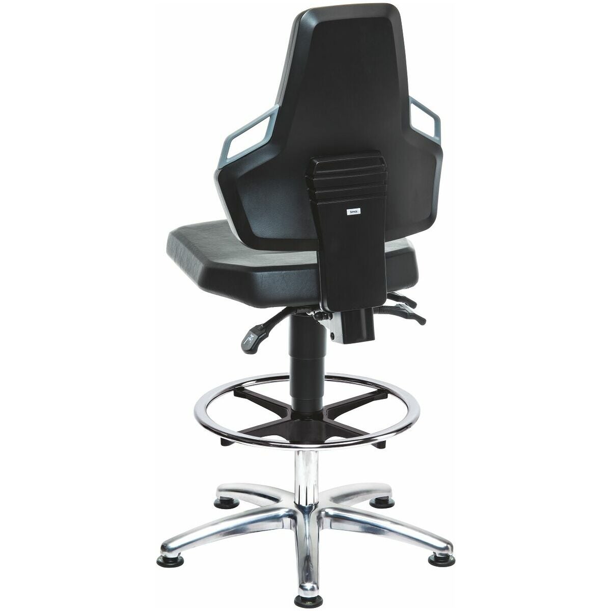 Sits och ryggstöd av ledande ESD-konstläderklädsel, bekväm och mjuk. Tvättbar och lättskött. Ryggstöd med ledande plastskål. Fotkors av polerad aluminium.