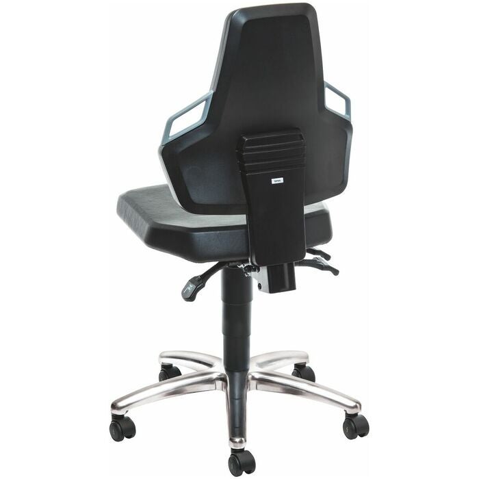 Sits och ryggstöd av ledande ESD-konstläderklädsel, bekväm och mjuk. Tvättbar och lättskött. Ryggstöd med ledande plastskål. Fotkors av polerad aluminium.