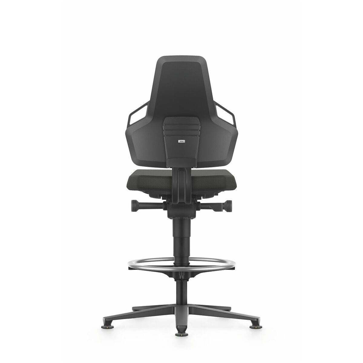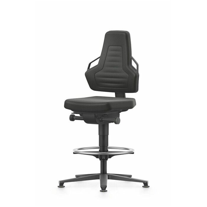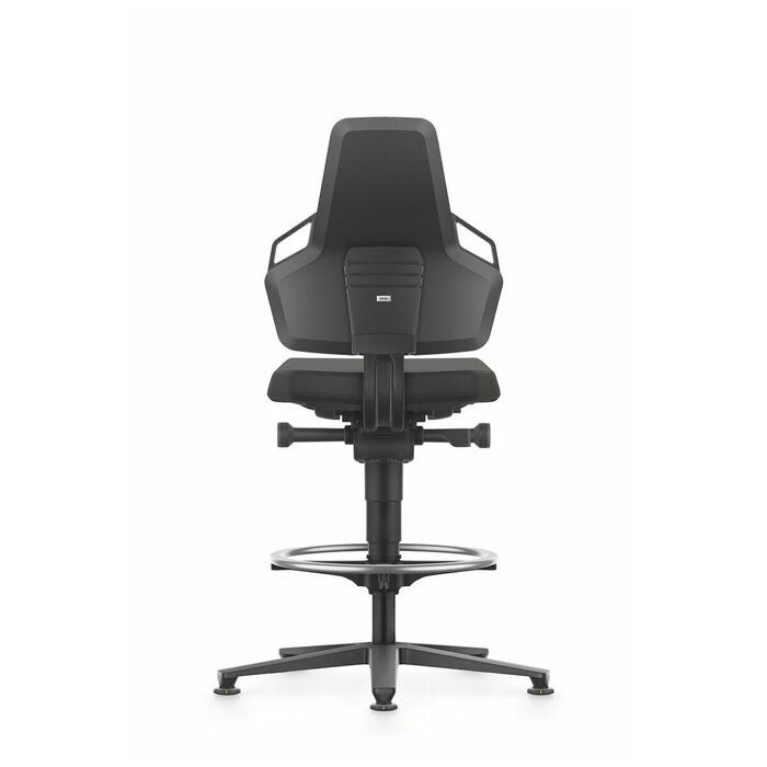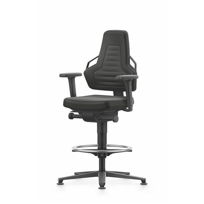 säte och ryggstöd av ledande ESD-tygklädsel. Bekväm och andningsaktiv, slitstark. Bekväm klädsel med ergonomiskt ryggstöd och horisontell quiltning, med praktiska skjuthandtag. Med ergonomipaket: Synkronteknik inklusive viktreglering. Genomgående elektriskt ledande förbindelse från stoppningen till ESD-rullarna/-glidknapparna. Ryggstöd med ledande plasthölje och skjuthandtag.