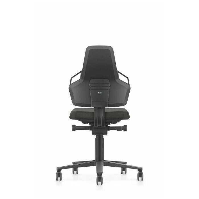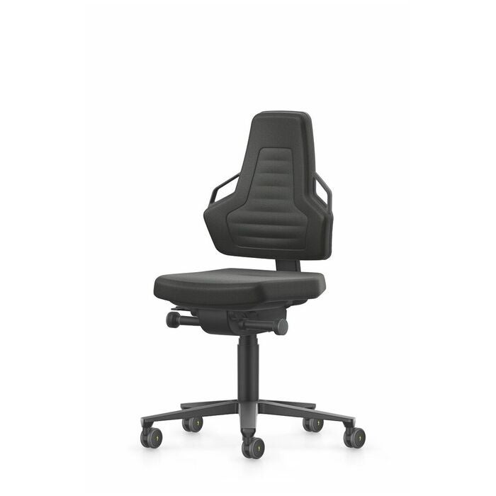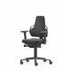 säte och ryggstöd av ledande ESD-tygklädsel. Bekväm och andningsaktiv, slitstark. Bekväm klädsel med ergonomiskt ryggstöd och horisontell quiltning, med praktiska skjuthandtag. Med ergonomipaket: Synkronteknik inklusive viktreglering. Genomgående elektriskt ledande förbindelse från stoppningen till ESD-rullarna/-glidknapparna. Ryggstöd med ledande plasthölje och skjuthandtag.