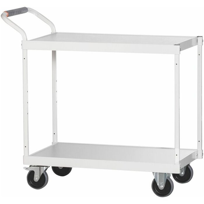 Bordsvagn ESD-ledande med 2 lastytor. Svetsad stålkonstruktion, plattform tillverkad av volymledande spånskiva med ljusgrå, ESD-ledande yta. ESD-ledande Haptoprene-handtag med stöttålig polypropylen.