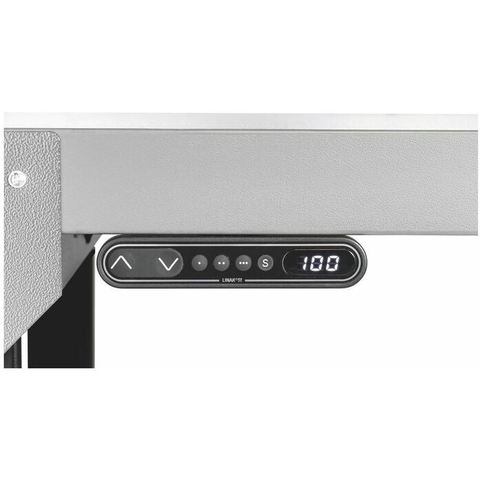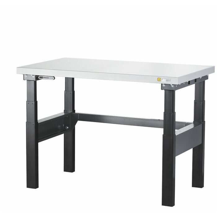 ESD-arbetsplats med elektrisk höjdinställning. Icke ledande stativ med lyftenhet och tvärstagningar för stabilisering på sidorna och baktill. 50 mm tjock volymledande ESD-skiva. Icke ESD-ledande manöverpanel.