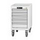 Med vardera två kullagrade fasta och svängbara hjul (svängbara hjul med spärr för hjul och vridkrans) ⌀ 125 mm med nötningståliga, elektriskt ledande hjul. Utdragslådor med enhands-enkelupplåsning förhindrar att utdragslådorna öppnas under transport.