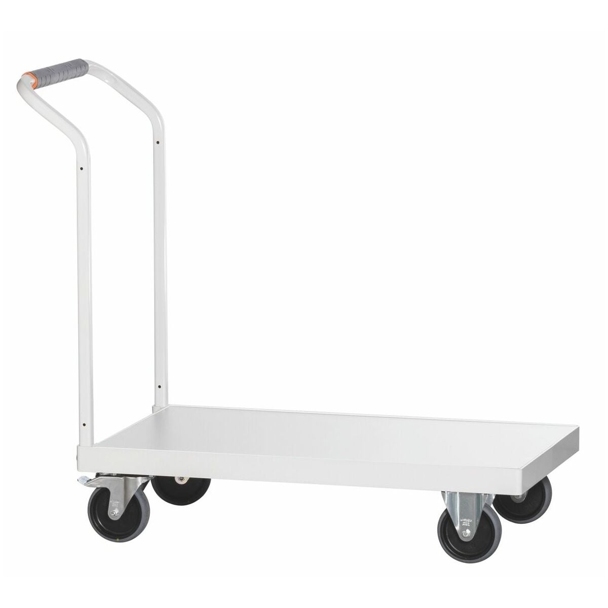 Skjutvagn med bygel ESD-ledande med 1 lastyta. Svetsad stålkonstruktion, plattform tillverkad av volymledande spånskiva med ljusgrå, ESD-ledande yta. ESD-ledande Haptoprene-handtag med stöttålig polypropylen.