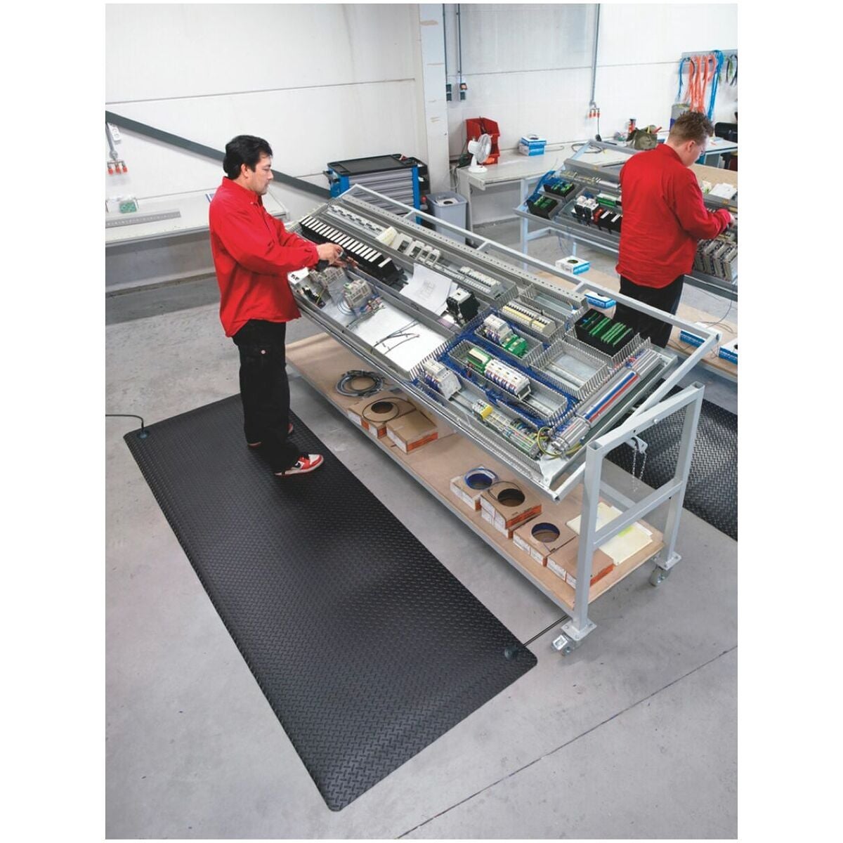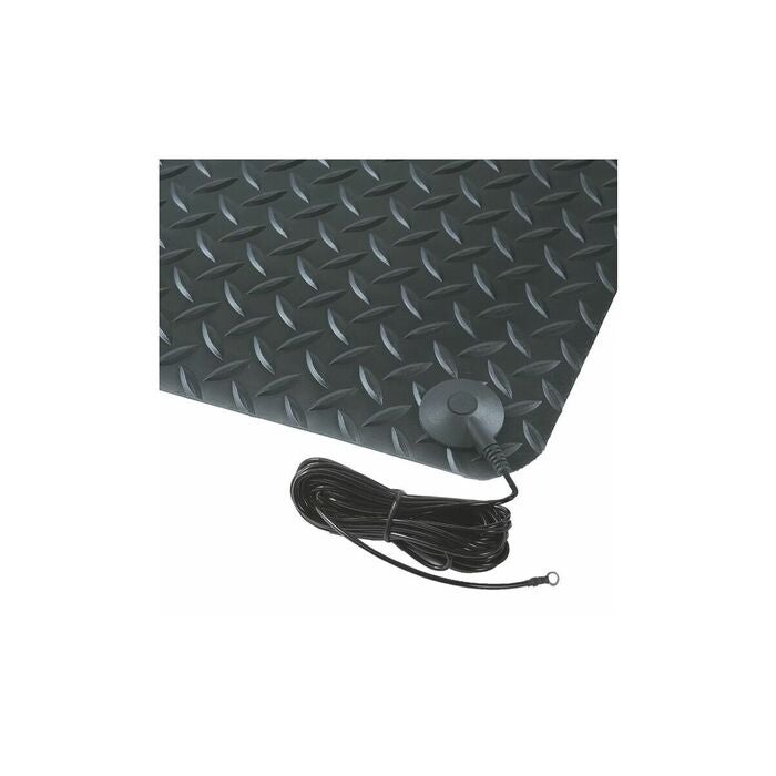 Statiskt avledande skyddsmatta, 14 mm tjock. Hållbar laminerad yta av mikrocellvinyl som motverkar trötthet. Försedd med 10 mm tryckknapp och jordkabel. Hög halksäkerhet (R9 enligt DIN 51130 och BGR181) samtidigt som durkplåtsmönstret underlättar vridrörelser. Halkskydd på undersidan förhindrar glidning och fyra fasade kanter ger minskad snubblingsrisk.