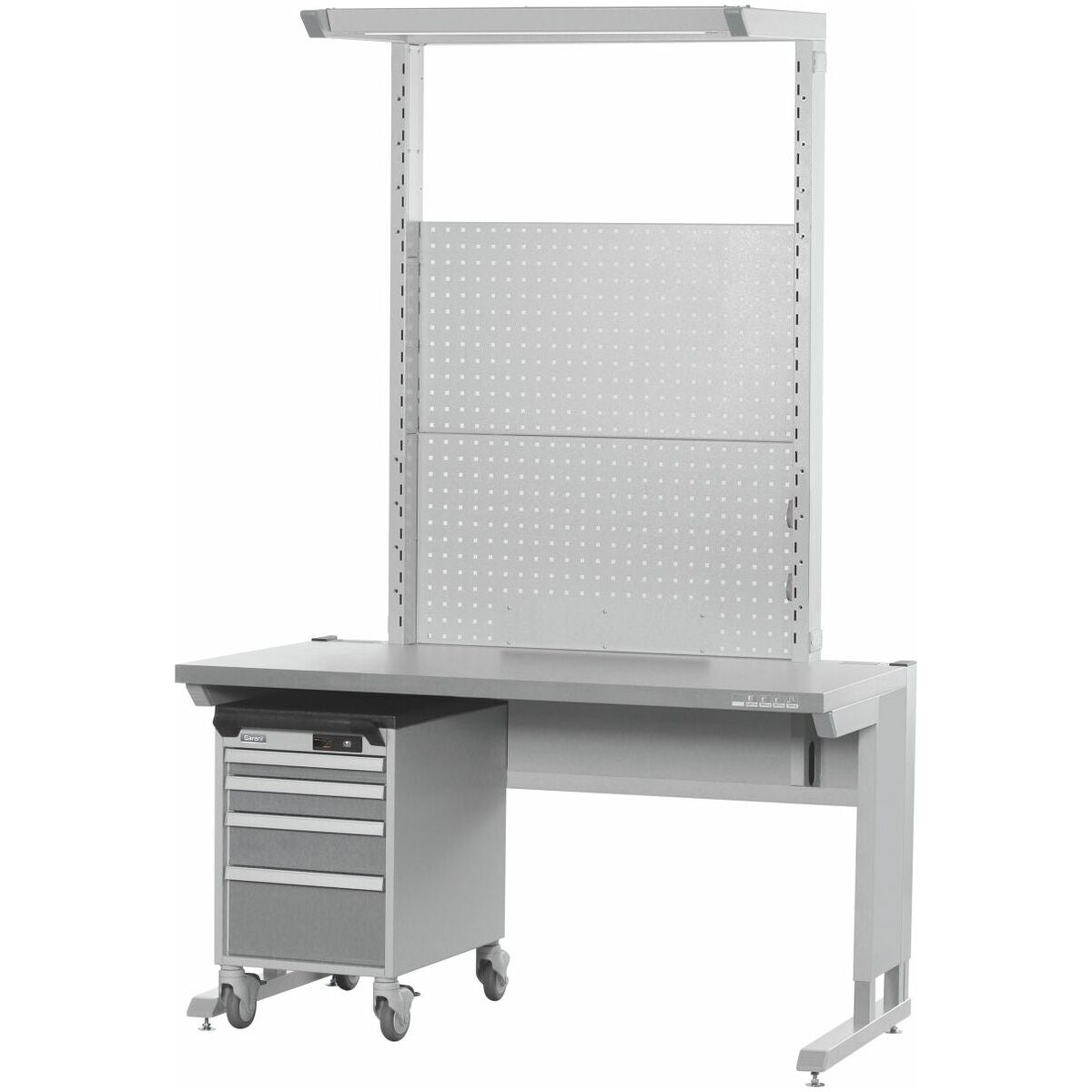 Av robust stålplåt. Arbetsyta utan hinder eftersom skarvplåtar saknas. Upphängningsslitsar i 50 mm-raster på framsidan samt gängade hylsor på fram- och insidan för infästning av ytterligare moduler som perforerad panel, avläggsskiva med mera. Öppningar på stolpens sida för kabelgenomföring. Levereras parvis.